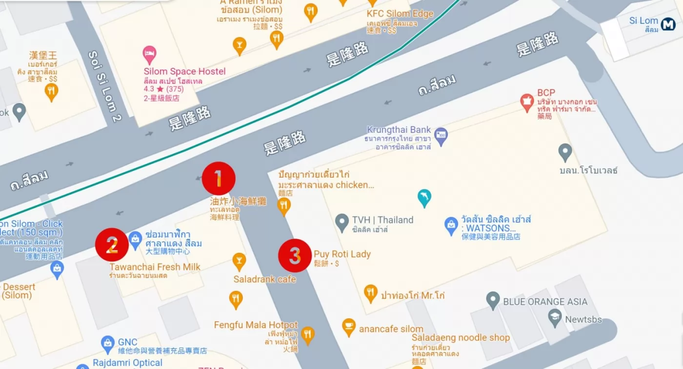 曼谷西隆(Silom)路第1巷,也就是BTS的SalaDaeng站和MRT的Silom站中間的SalaDaeng巷口,有3家超熱賣的小吃,不可錯過!