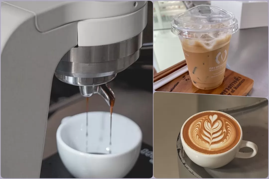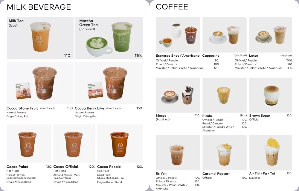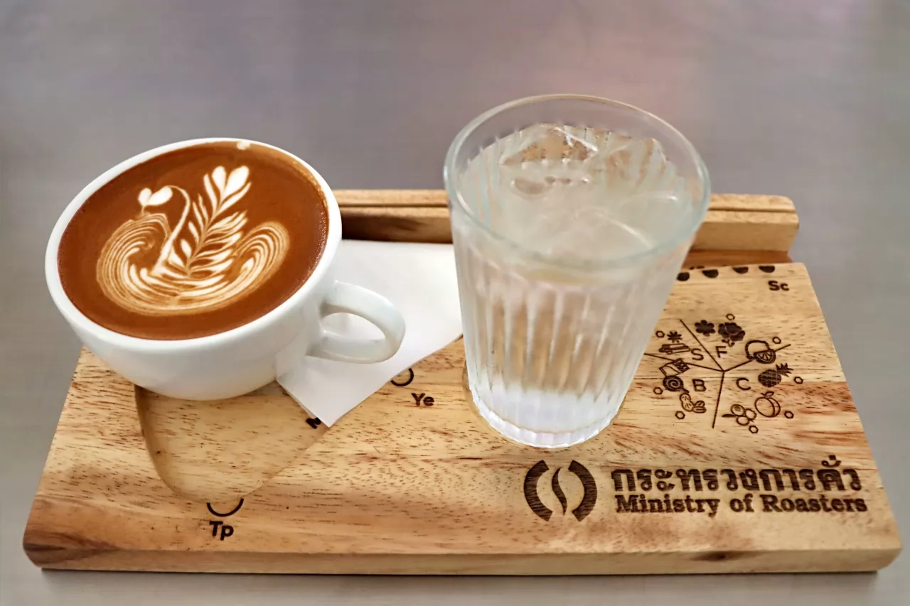 沖泡—各種品項的名稱都經過精心設計,無論是用咖啡機或手沖,店員能夠很清楚的介紹合適顧客的需求,並充分的掌控好流程,泡出一杯令顧客滿意的咖啡。熱拿鐵(1杯100銖)展示高水準的拉花。