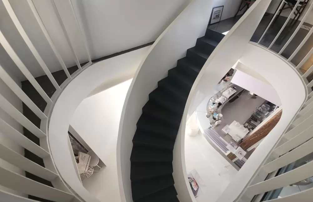 因為O先生曾經是建築師,得自咖啡烘焙每階段能量變化的靈感 ,商店裝飾強調形狀和動態的曲線,外牆、天花板、板凳等的裝置,超酷!