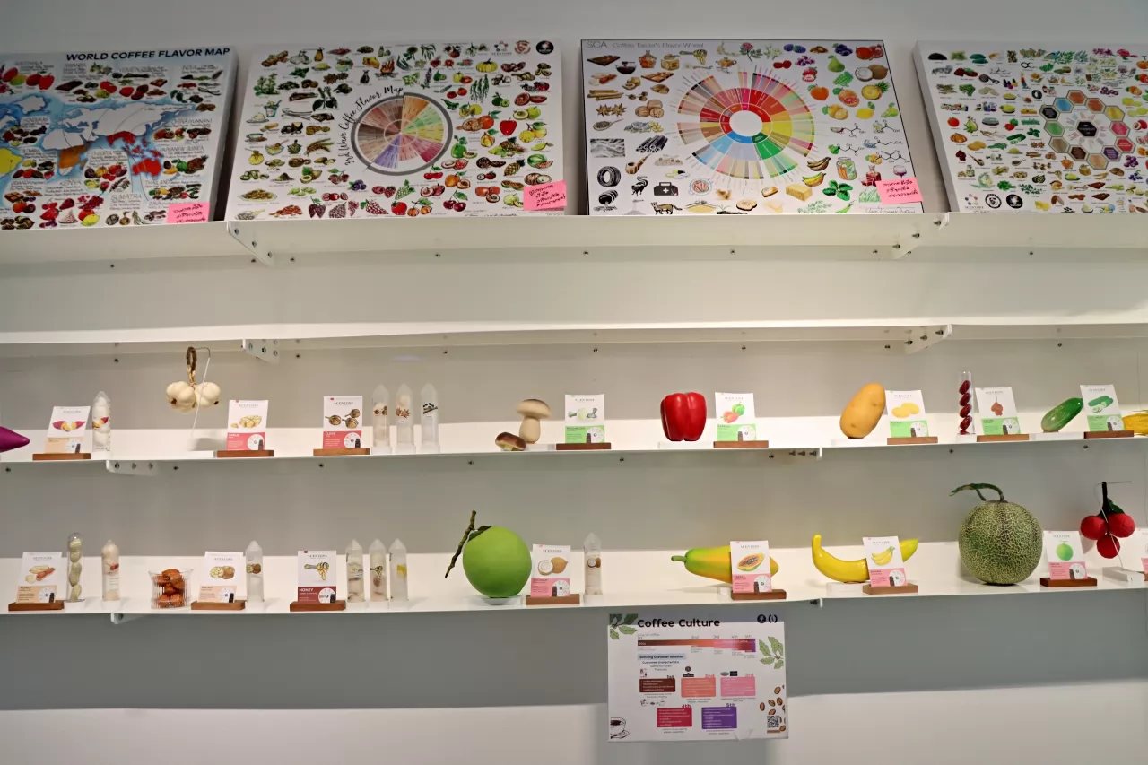 在等待點餐的同時,店內的一面牆上展示不同咖啡豆的獨特香味,可以一邊走一邊聞,了解不同種類咖啡的特色。