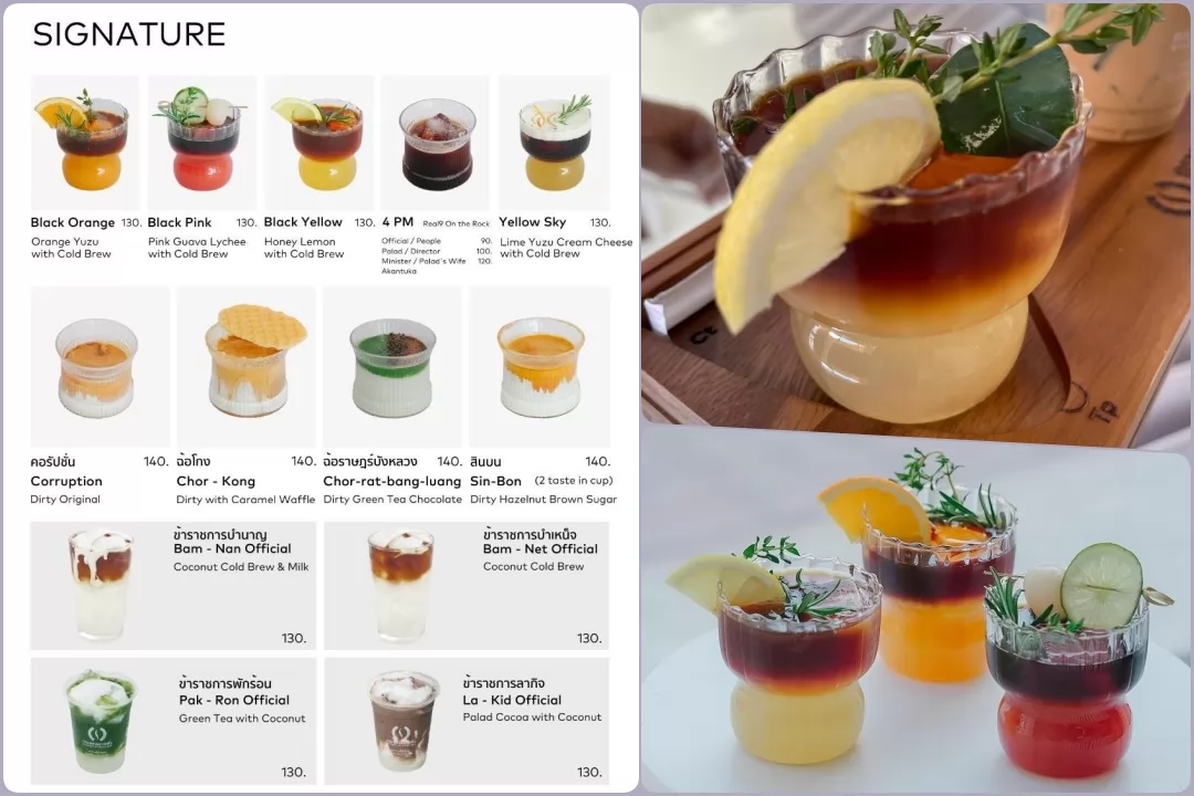 創新—除了咖啡,這家店還特別重視與水果的結合,牆上有各種水果甜度表,推薦其中3款(1杯130銖)—Black Yellow:蜂蜜檸檬菜單酸甜完美,口感醇厚;Black Orange:清爽的百香果橙汁,帶有淡淡的柚子餘韻,味道醇厚;Black Pink:甜美的菜單,以荔枝、粉紅番石榴和最後的冷藍色為特色。