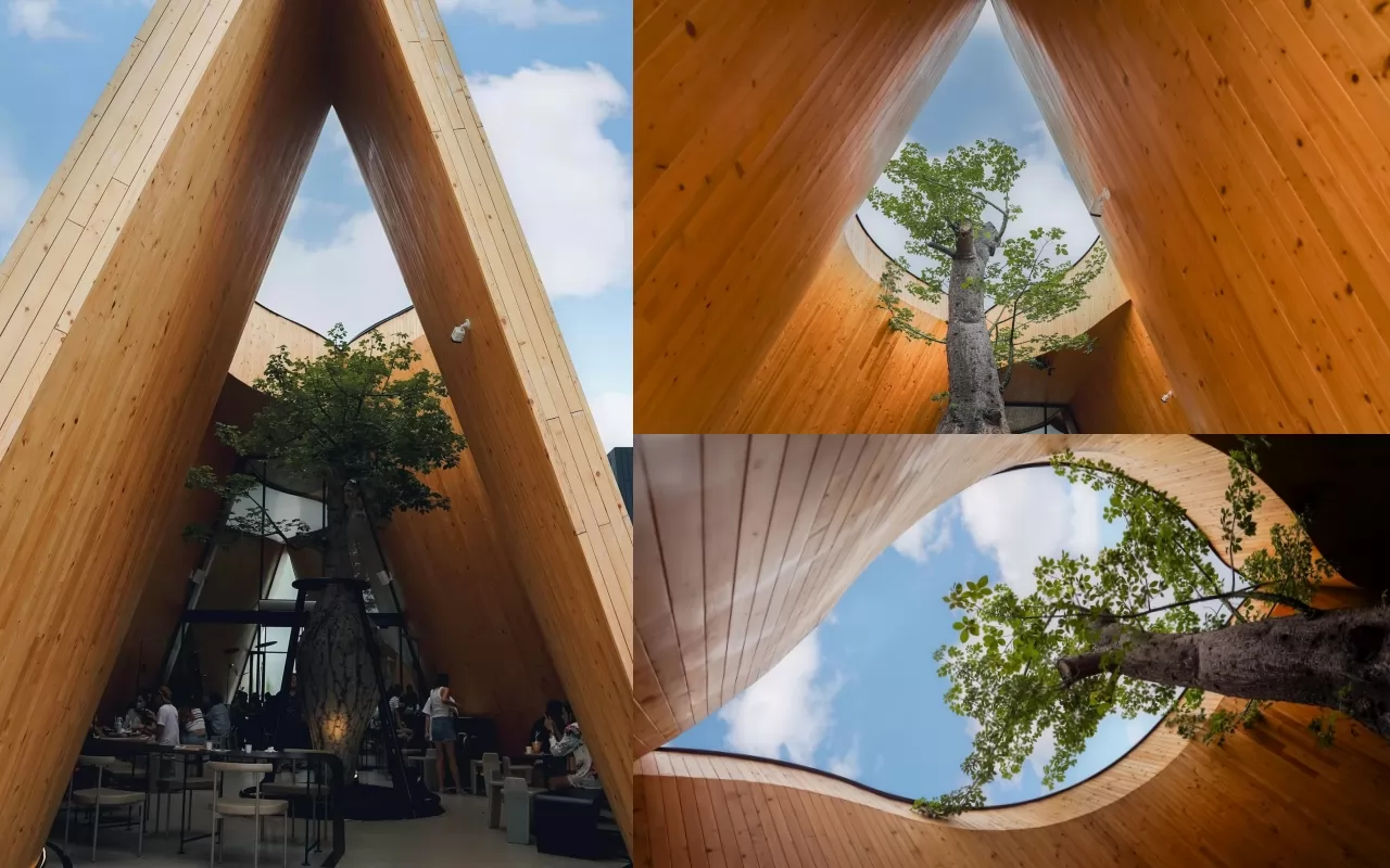 咖啡店的空間以3個簡練黝黑的山形空間組成,大型猴麵包樹(baobab)彷彿突破屋頂的屹立庭園。