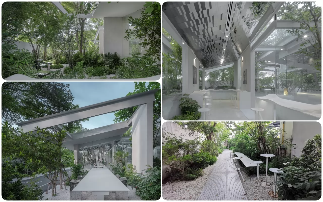 簡潔的設計將既有主屋向外延伸,三間並排的純白極簡建築,傾斜的屋頂呈現波浪式的律動。透過開闊的玻璃幕牆與周遭環繞的植栽,軟化室內與室外/建築與景觀的空間界線,獲得 2023 金點設計獎空間類的年度最佳設計獎殊榮。