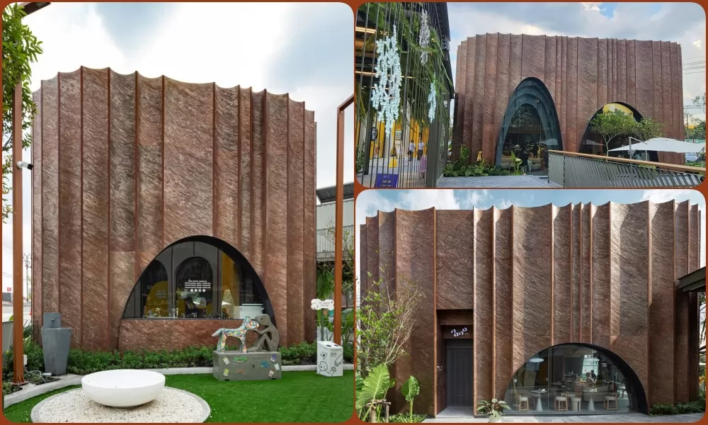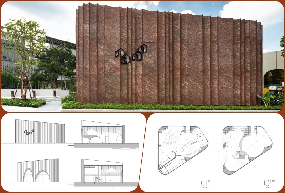 在外觀設計上,以紅銅色曲面石材板建構出的立面,只開三處半圓形落地窗,透過照明設計襯托出如洞穴岩石壁面的粗糙紋理。