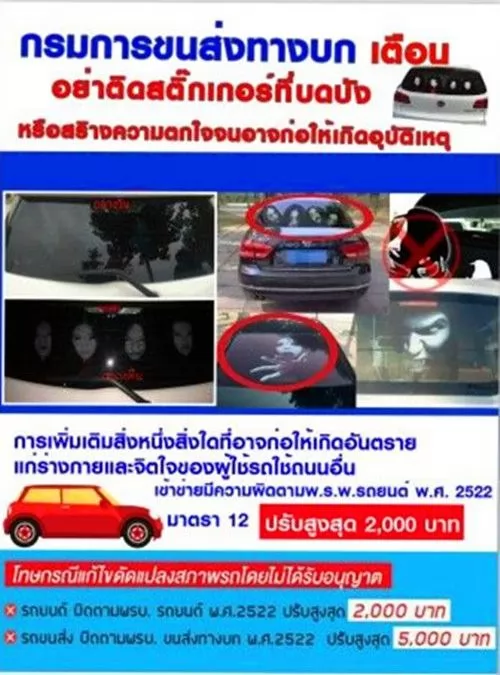 泰國陸路運輸廳表示,目前網路上瘋傳貼在汽車擋風玻璃上的恐怖照片,嚴重妨礙其他司機駕駛,極易引發交通事故,違反1979年汽車法第12條規定,將被處以2000泰銖以下罰款。為了安全,這樣的處罰就「泰奇.不忸」了!