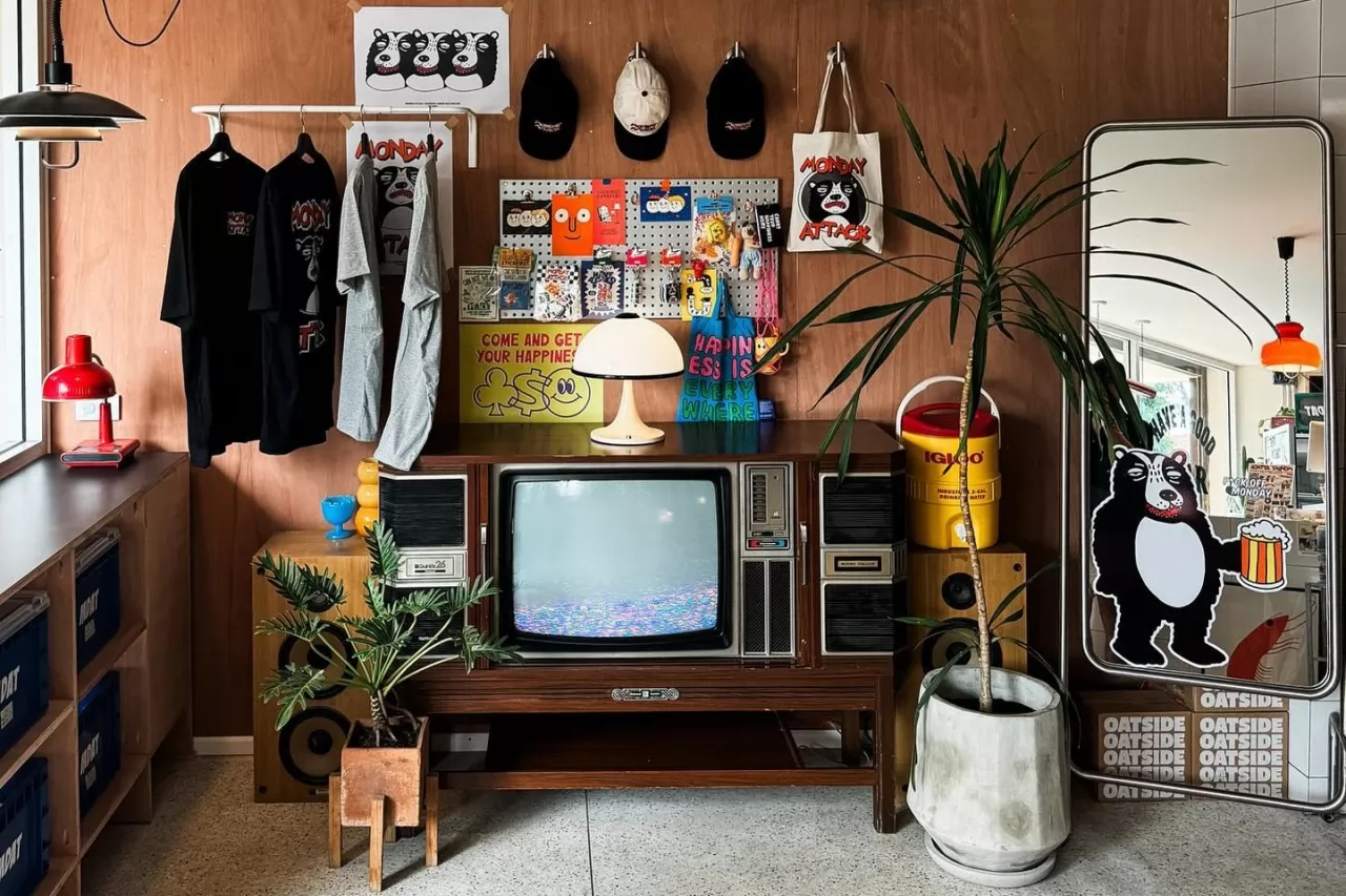 店內、店外都藏不住店主的淘氣,用美式街頭感很重的色塊填滿整個空間,很漂亮,主題鮮明,有樹木增添綠色氛圍,還有貼紙、明信片、棒球帽等小物供選購。