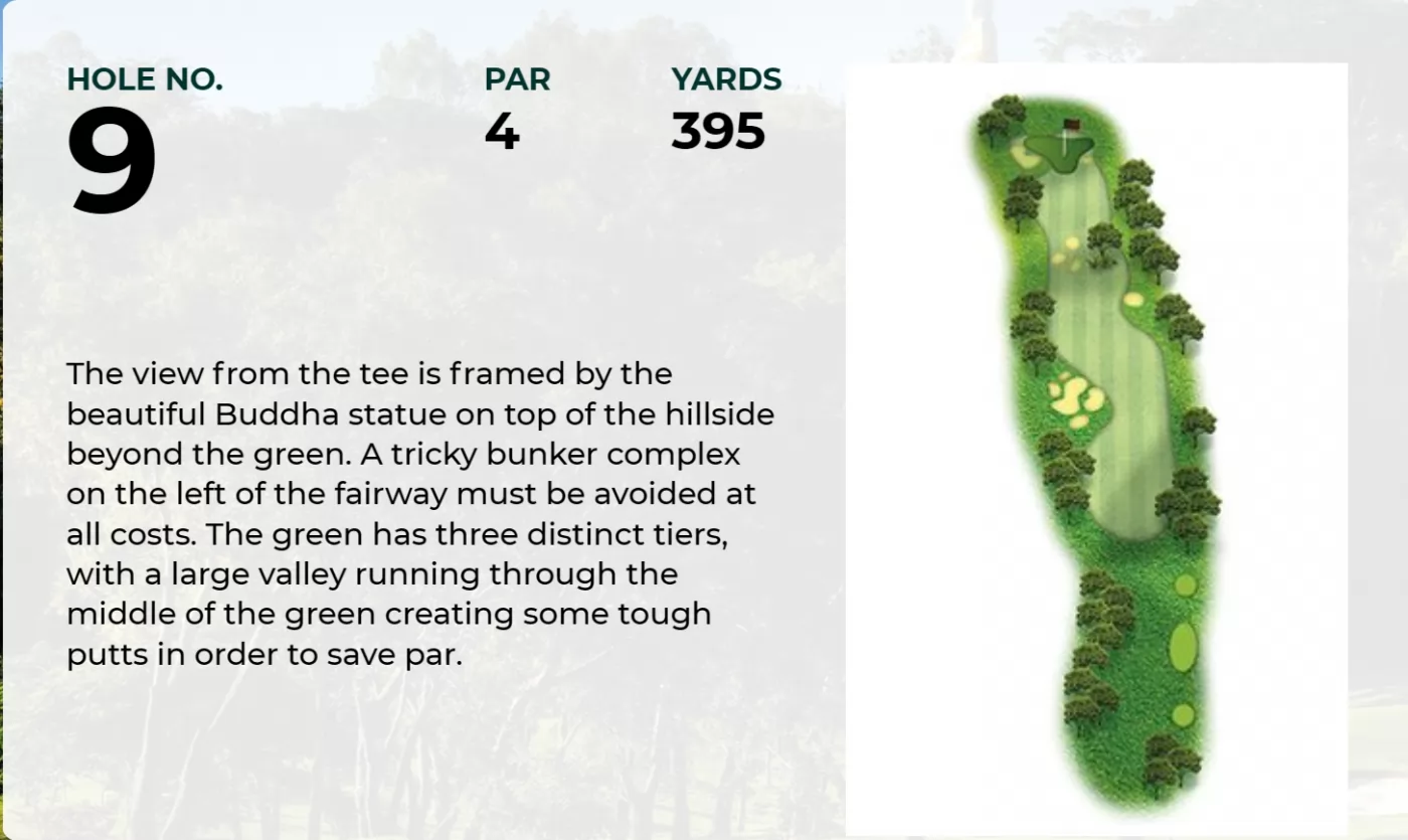 球道轉彎處,有一尊巨大的金色佛像守護著進入陡峭的果嶺。第2桿讓許多LPGA明星付出代價,因為凸起的果嶺不僅被沙坑包圍,坡度極大,即使你ON上果嶺,小白球也可能滾出40公尺遠。這個洞上演的戲劇比泰國肥皂劇還要多。