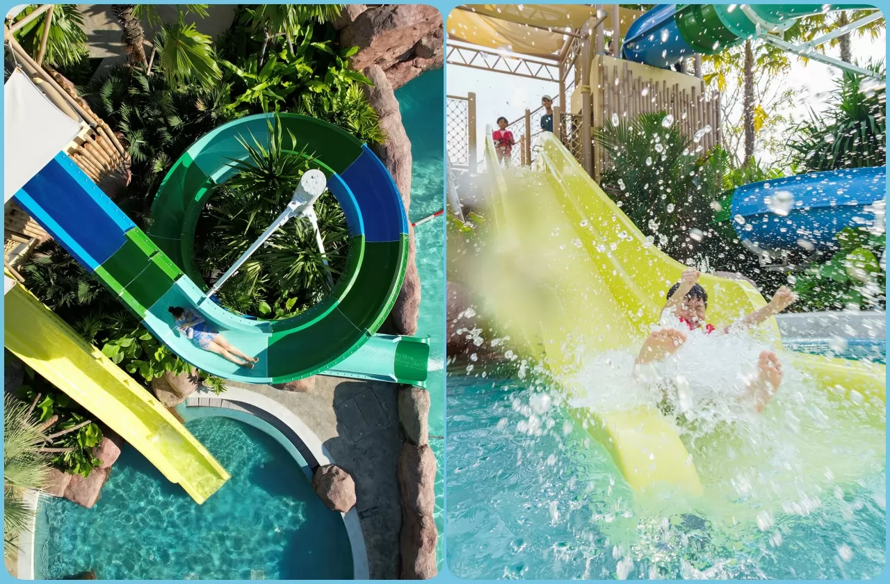 走下2樓,沒進到水上樂園,大人小孩的歡樂聲已傳入耳,人最多的地方是大型的人造夏威夷波浪池,海浪一波一波沖過來,超好玩!大人小孩都玩到不想離開, 左邊有刺激的滑水道,右邊是蘑菇形狀的兒童戲水區,還有玩沙區,小孩放電的好地方,成人在休息區享用食物、飲料和水療按摩服務。