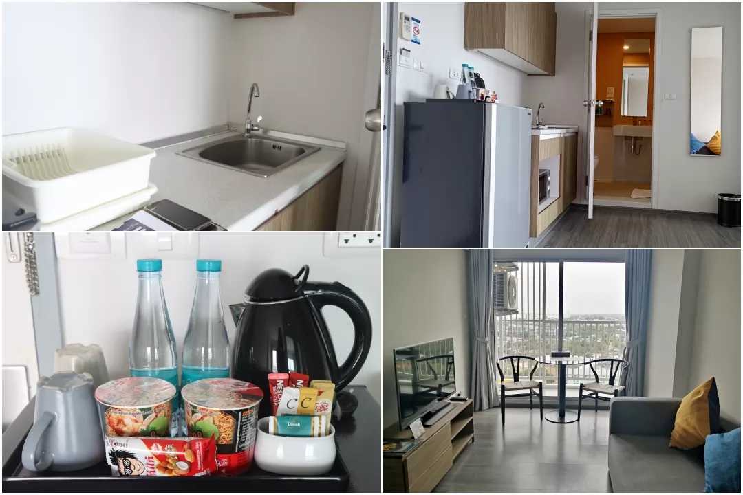 使用房卡進入房間,設施齊全,有衣櫃、保險箱,分立式的浴室,免治馬桶,冰箱上提供免費的迷你吧,還有微波爐等的廚房設備可做使用,非常便利,客廳的餐桌、沙發和電視也沒少。