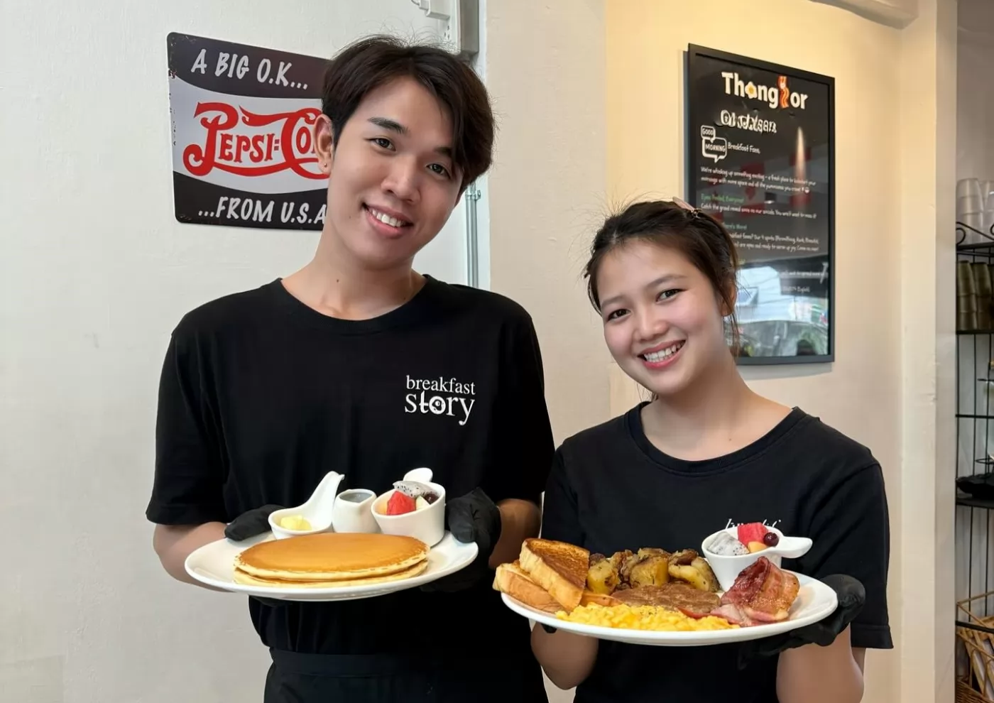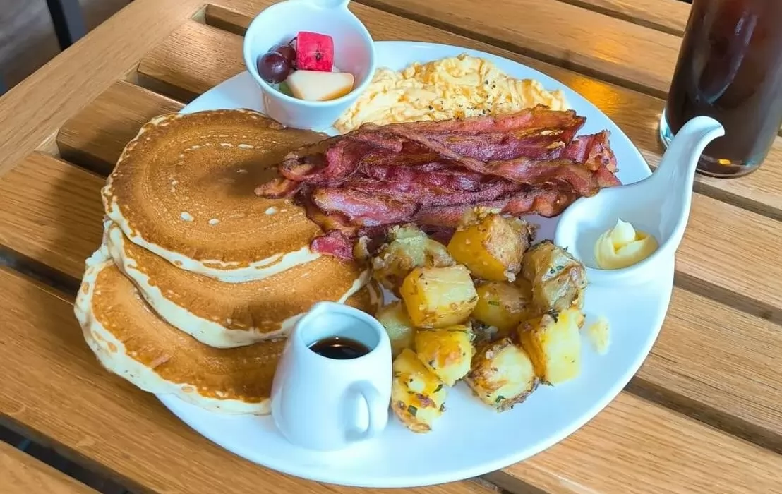 300泰銖 的全日早餐(Breakfast Story),份量十足,3 個鬆軟的煎餅、2 個荷包蛋或炒蛋、培根和原塊美式馬鈴薯,配上真正的黃油和精選糖漿。