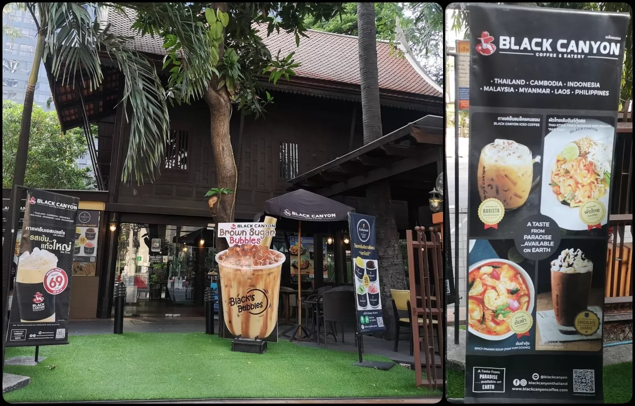 名連鎖咖啡集團Black Canyon Coffee在MRT的Sukhumvit站旁邊開分店,這裡與BTS的Asok站相連,是商業區及遊客區的黃金地段, Terminal 21商場也在這個地段,卻隱藏這棟翠綠植物所包圍的泰式木製老屋。