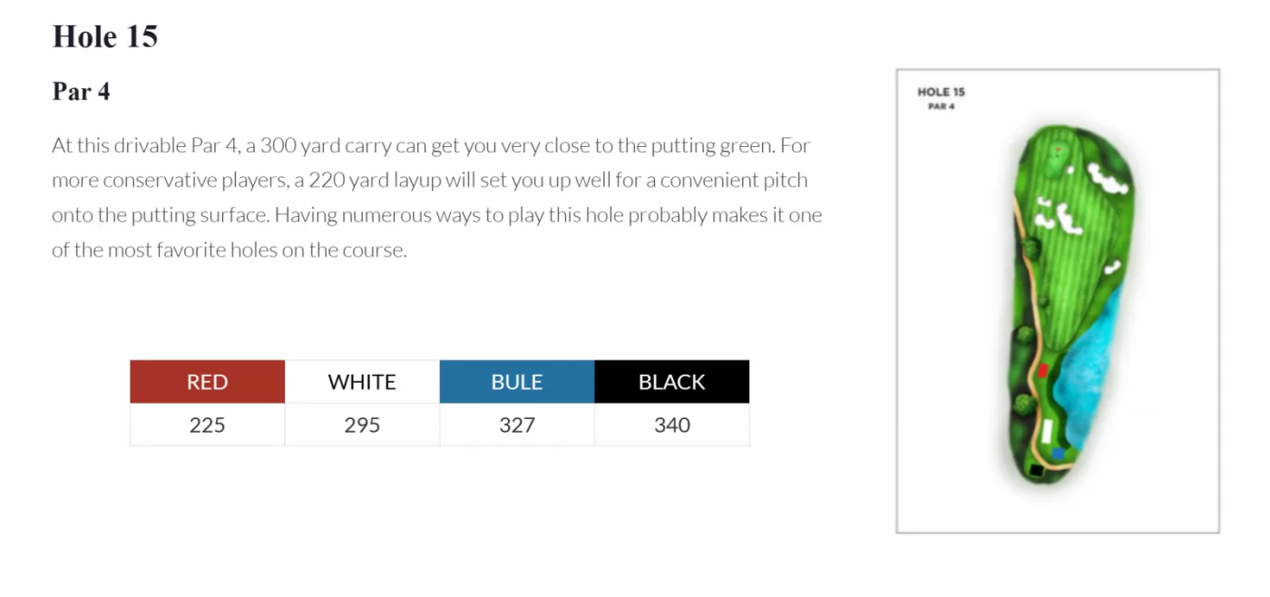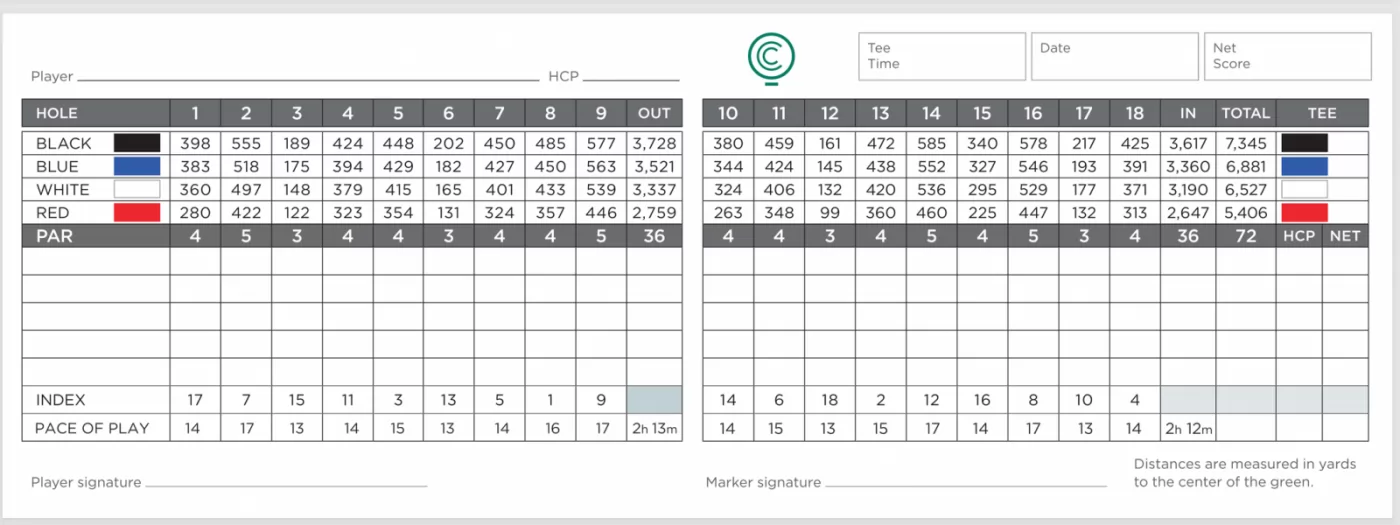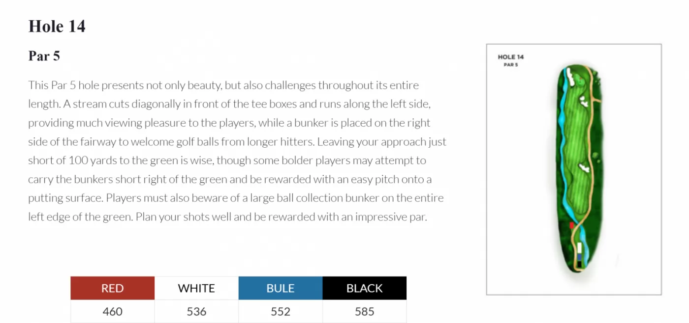 18 洞 標準桿72 桿,佈滿了鬱鬱蔥蔥的球道、翠綠的山丘、湖泊,從 6,527 碼到 7,345 碼,可以找到適合各種選手能力的距離挑戰。