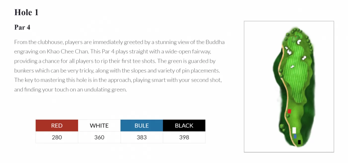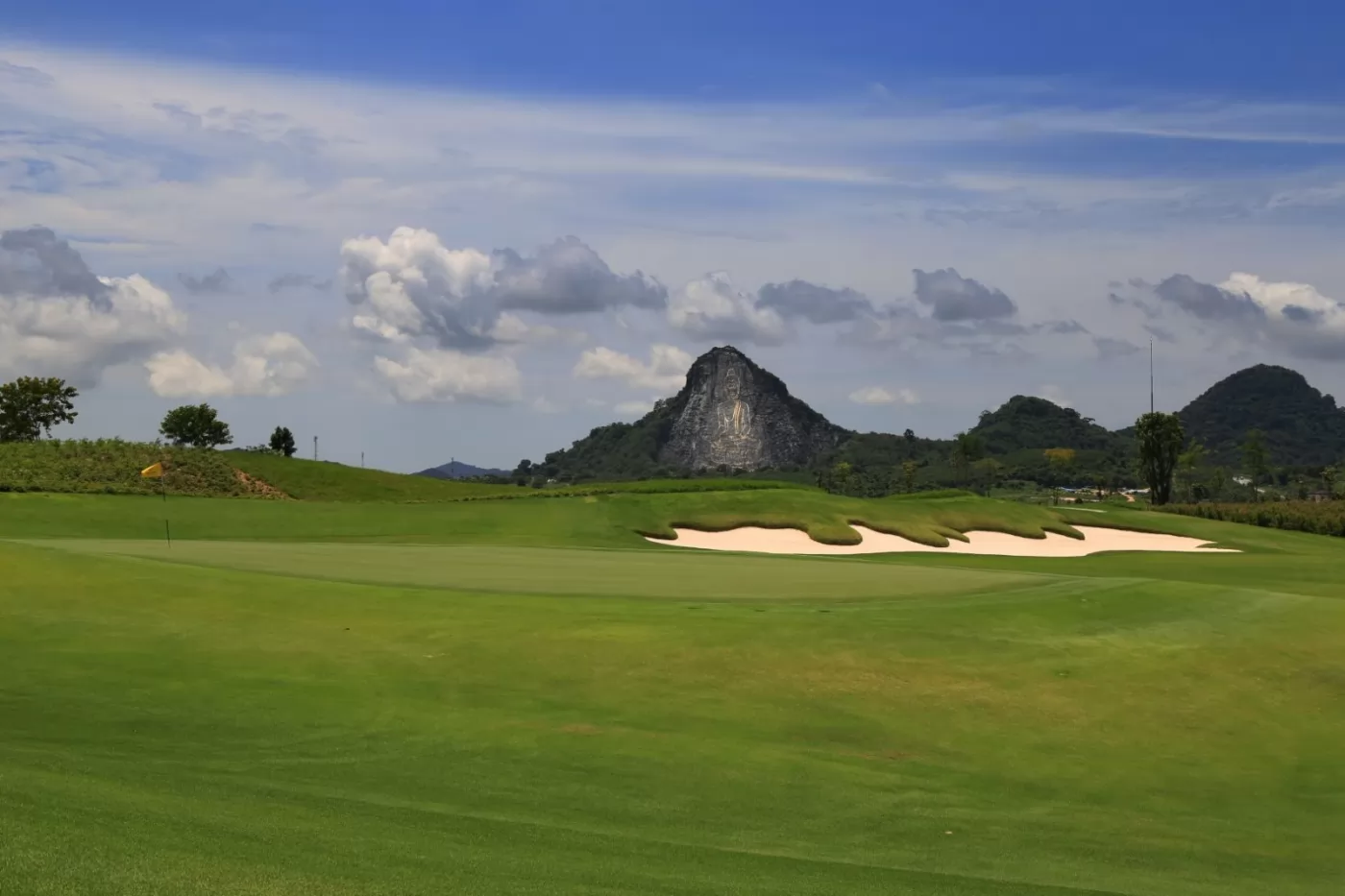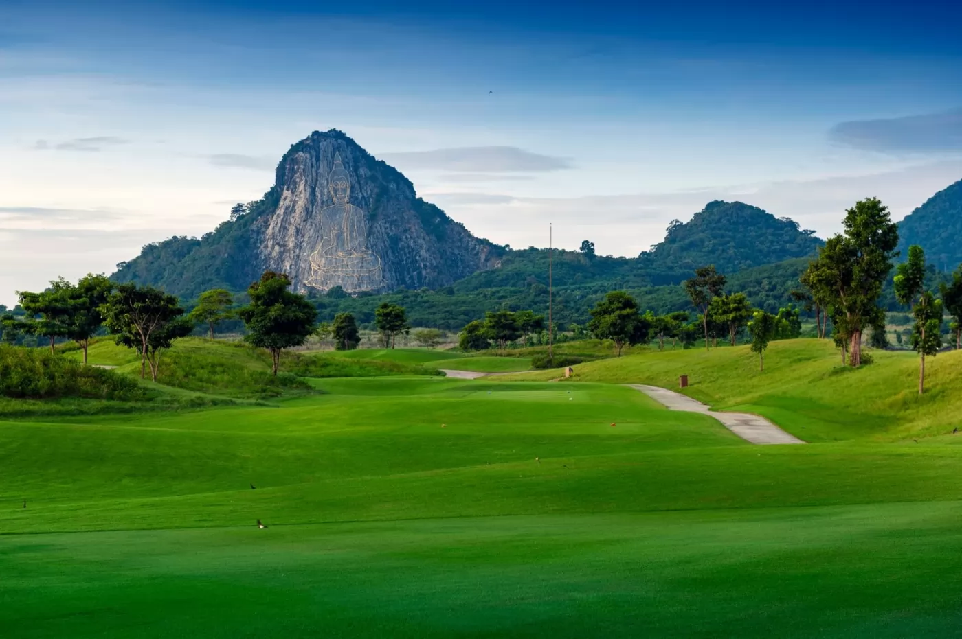 很多人聽說過 Chee Chan,可能是因為山面懸崖上雕刻的金色七珍佛像(Khao Chee Chan),110公尺高,被認為是世界上最大的佛像。1996年,為了慶祝泰九世皇登基50周年,佛陀被正式命名為Phra Phuttha Maha Wachira Uttamopat Satsada,象徵和平與寧靜,如今是知名的景點,這個高球場就在佛像的下方,其視覺效果令人驚嘆,同時也是一項高爾夫挑戰。