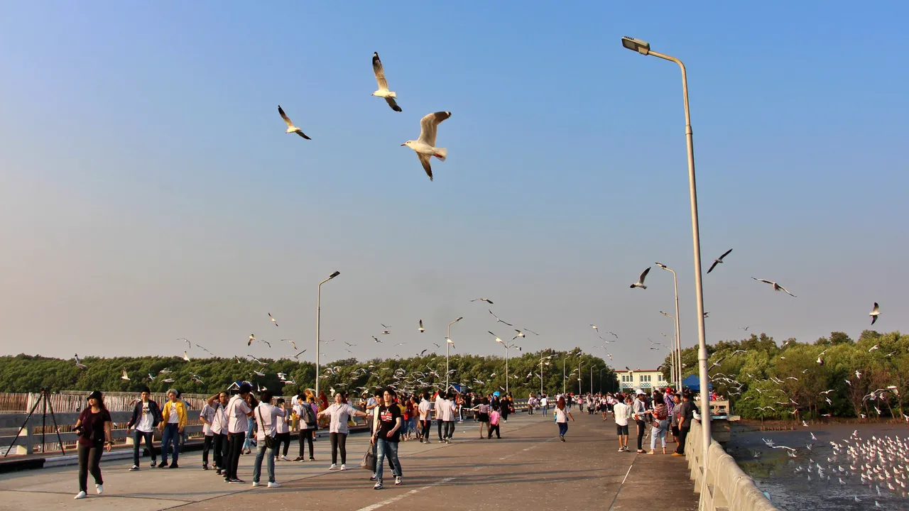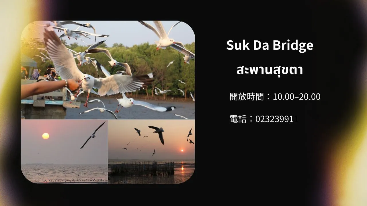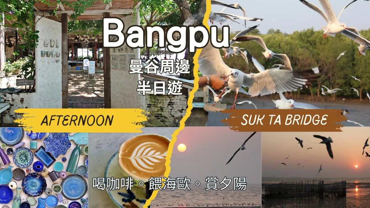 搭BTS淺綠線到北欖府(Samutprakarn)的Kheha(E23)站下,乘36號宋條車到邦浦(Bang Pu)海濱,在 文藝咖啡店Afternoon Bangpu放鬆,再轉素達橋(Suk Da Bridge)餵食海鷗,賞日落美景,成為曼谷周邊冬季最受歡迎的半日遊。