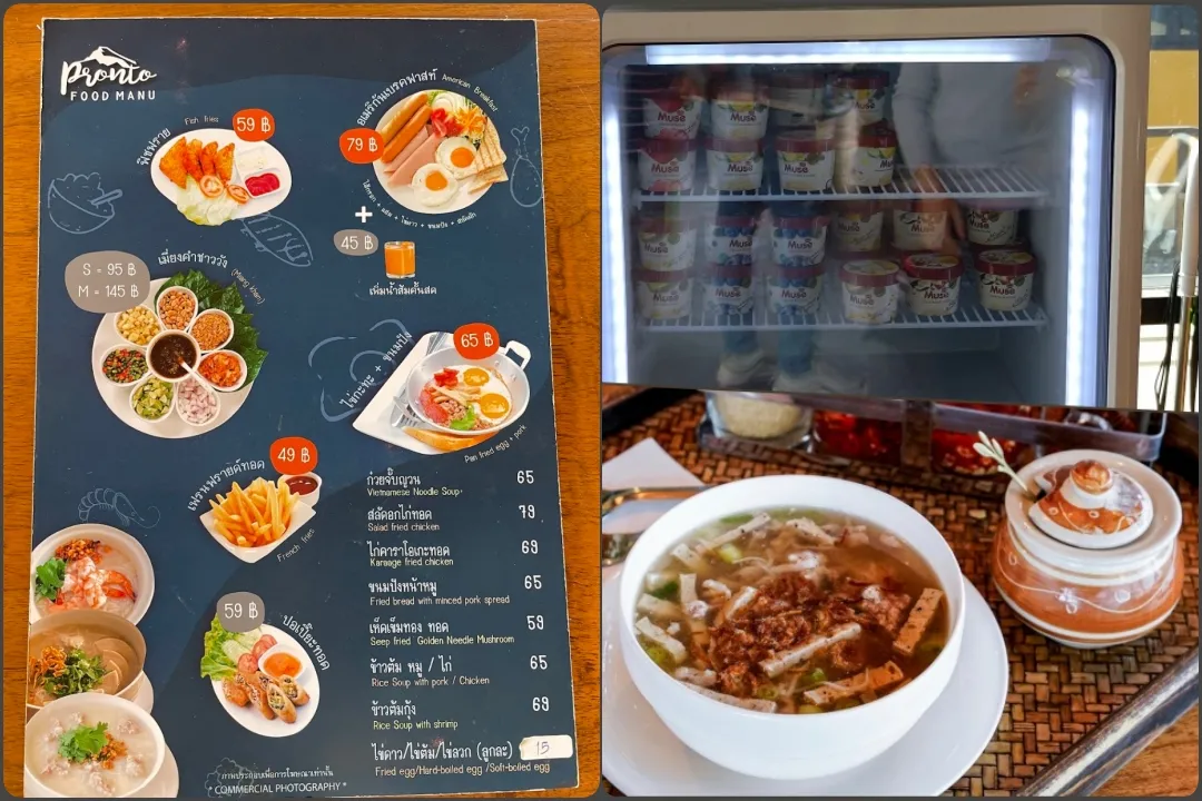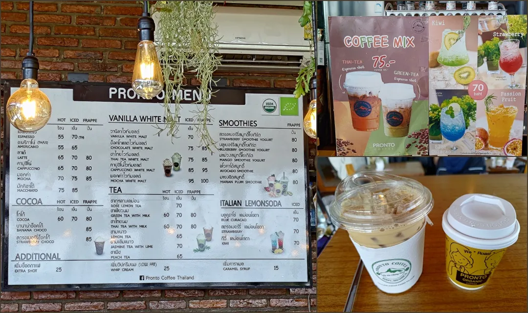 菜單上有咖啡,也有美味的食物,價格可愛,點了1碗越式粿條(65銖)和1杯冰拿鐵(70銖),加外帶1杯熱美式(55銖),味道都還可以。