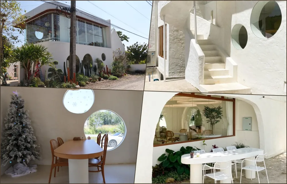 白色調的咖啡店使用圓形設計的傢俱, 座位可選室內和室外,室內區的裝潢是聖誕主題,非常可愛。室外有遊樂場,供孩子們奔跑玩耍。