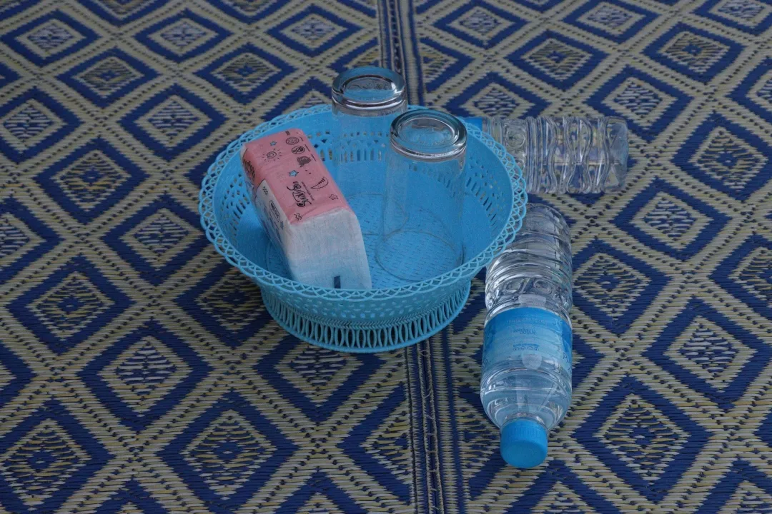 日落時刻,回到住處,帳篷前有席子,可以吃飯、坐著看風景。