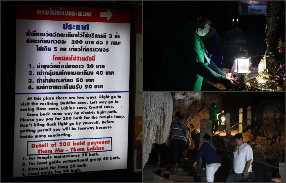 洞道深不可測,洞內有蝙蝠棲息。有很多條路徑,有開發的掛好電燈的,供遊人自行走;也有需租煤油燈(6人1組、每人100銖)、導遊帶路的路線(每人導遊費100銖),多處需要彎腰穿過的小洞。據稱還沒有人走到過洞的盡頭。