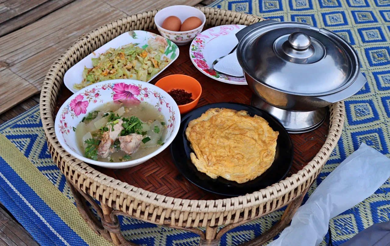 店家用竹編小圓桌送來晚餐,簡單的兩菜1雞肉湯加兩顆水煮蛋,傈僳族家常菜,喜歡煎蛋和辣椒醬,吃起來別有不同的風味。