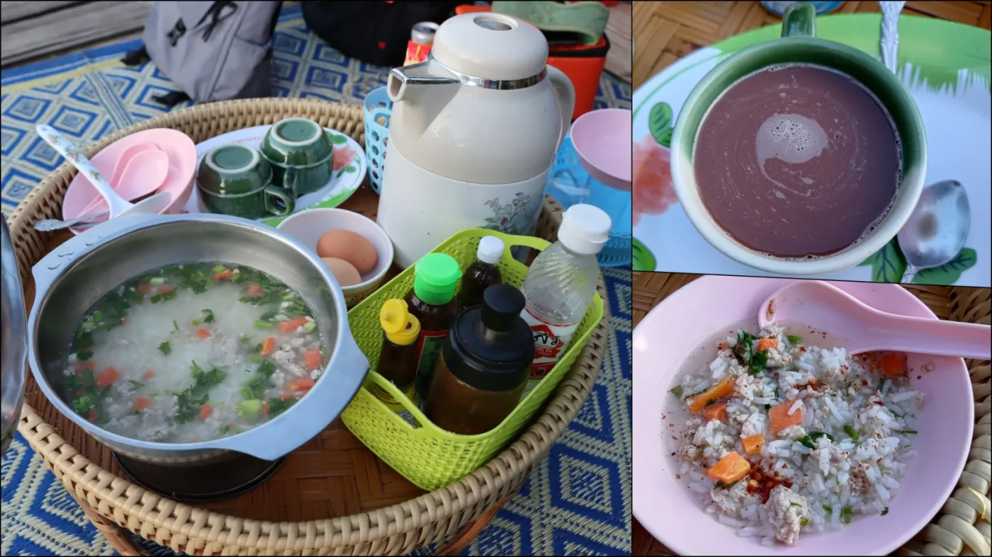 清晨六點,早餐就送過來,2顆水煮蛋、1鍋雞肉稀飯以及多樣調味料,1壺熱水來沖泡咖啡和可可粉,簡單美味。