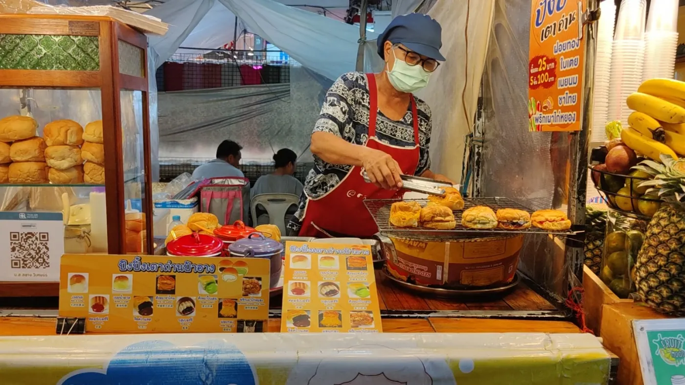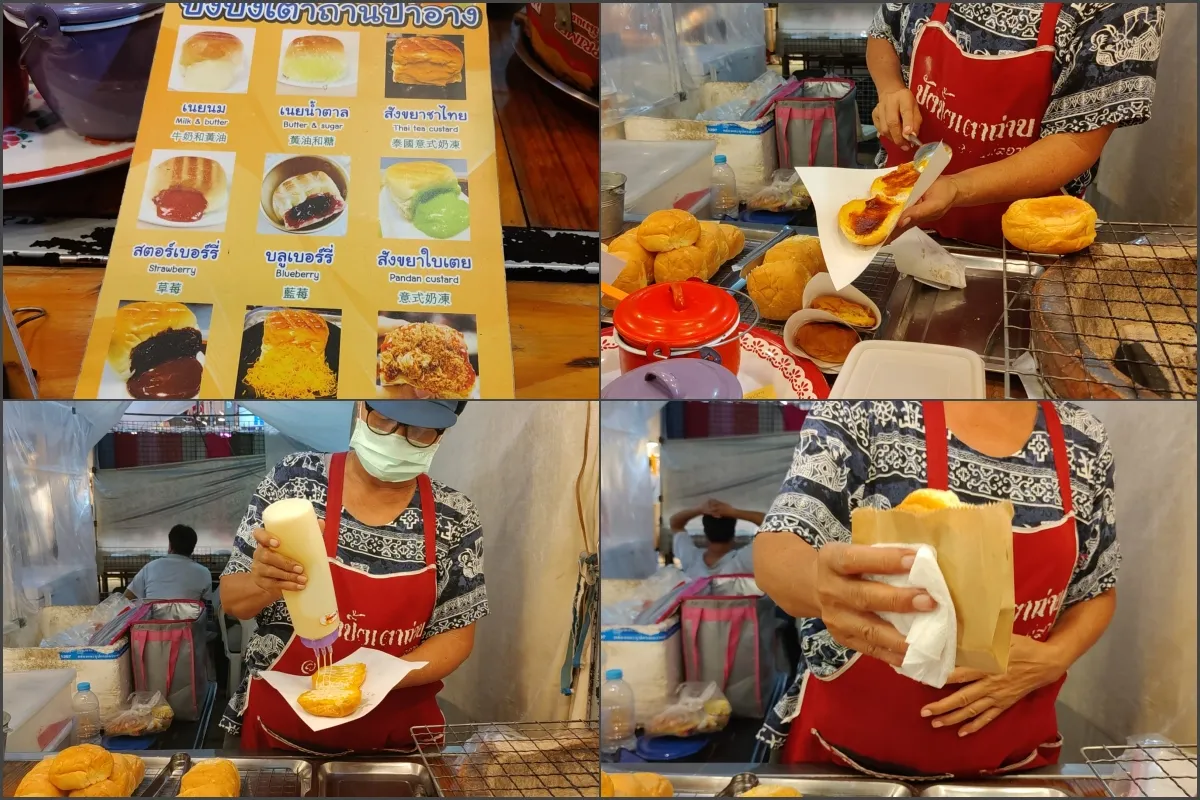 泰國夜市都可以找到烤夾心麵包,華欣夜市也有,這家安嬸的烤麵包有煉乳、奶油、泰奶、巧克力、草莓、藍莓等9種口味,1個25銖。
