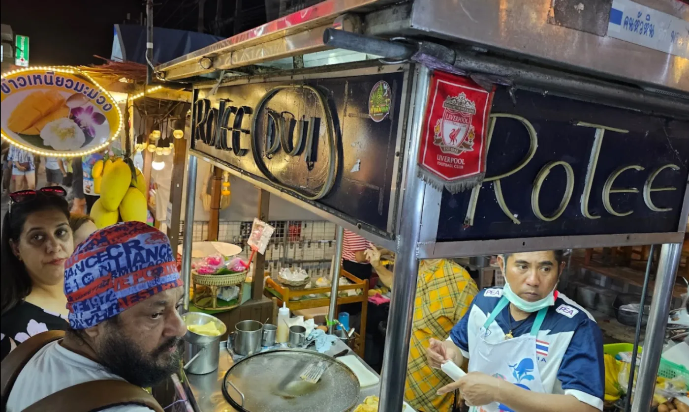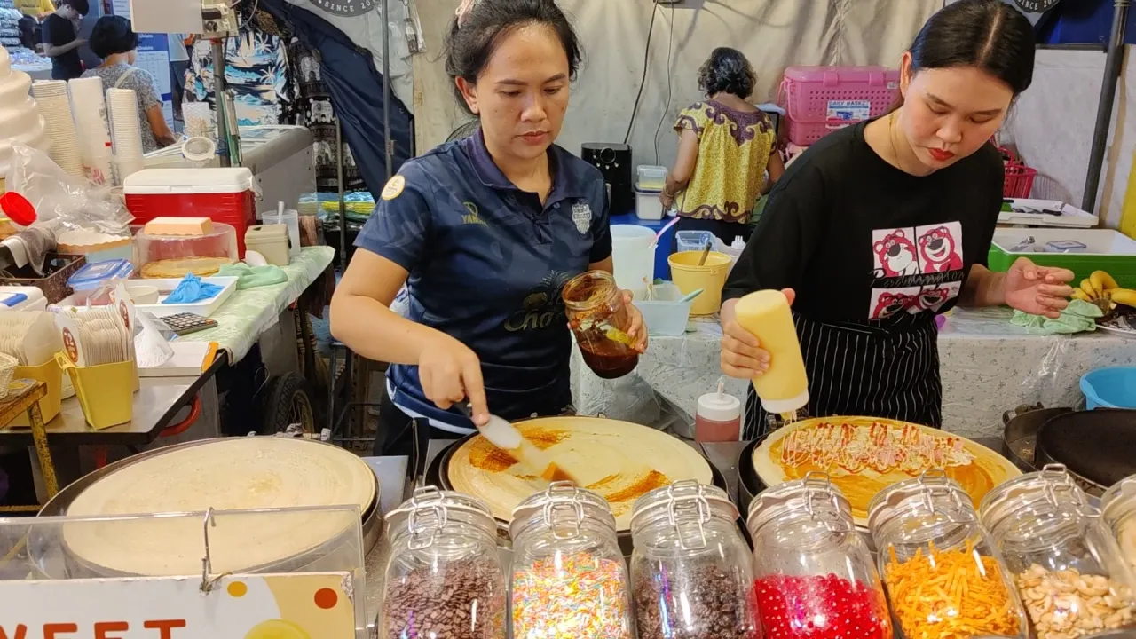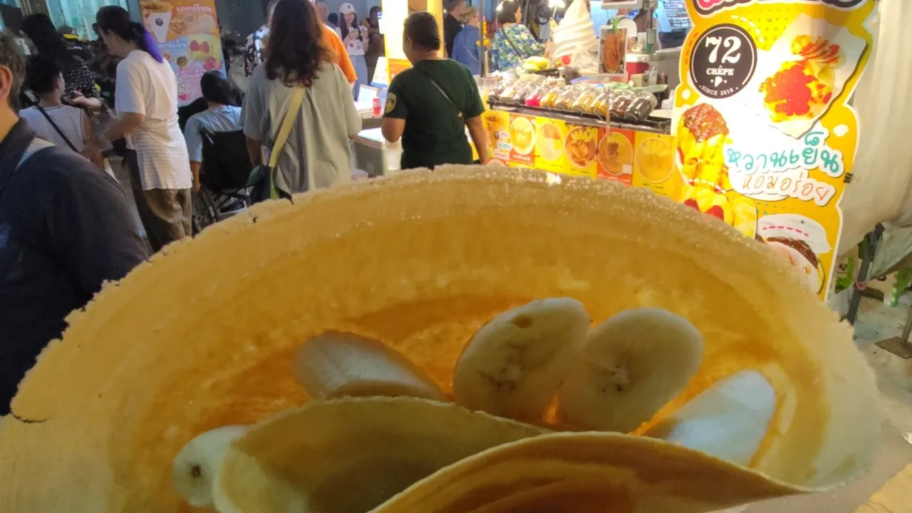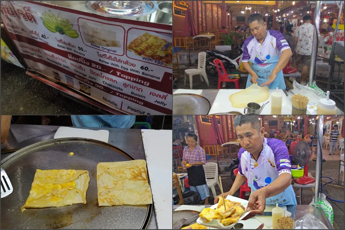 逛夜市還有一個不能錯過的小吃就是香蕉煎餅,推薦這家Rotee dui(ปุ๊กโรตี)鋪子,普通的30銖1盒,香脆可口,外面再澆上牛奶,可以加蛋40銖、加蛋和香蕉60銖,力推加蛋的煎餅,趁熱吃,超級棒!