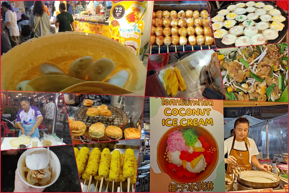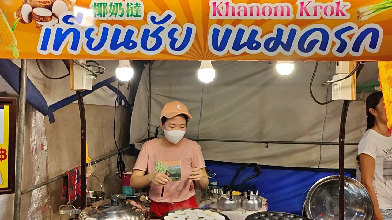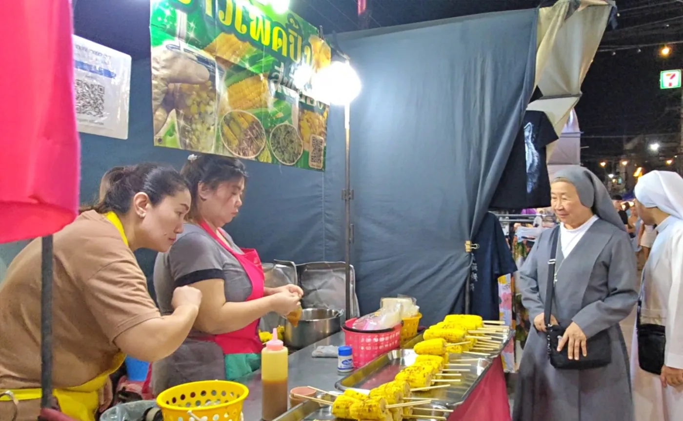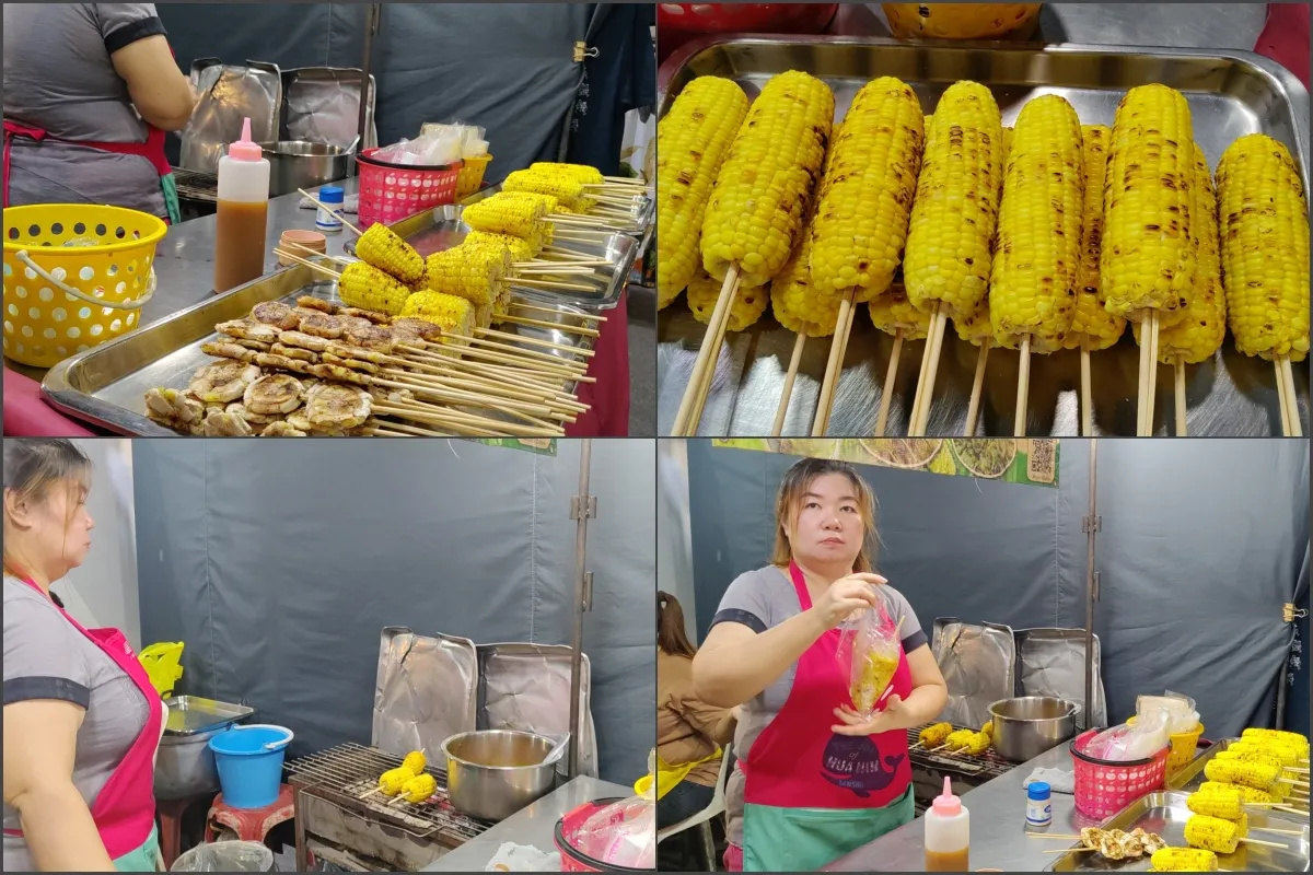 Si Phee Nong(ร้านข้าวโพดปิ้ง สี่พี่น้อง),這家的椰奶配起司烤玉米,玉米分為甜玉米和糯玉米,味道香甜可口無與倫比,一邊逛夜市一邊吃著玉米這也是一種享受。1條玉米只要15泰銖,除了玉米還有烤香蕉賣,也可以嘗試一下。
