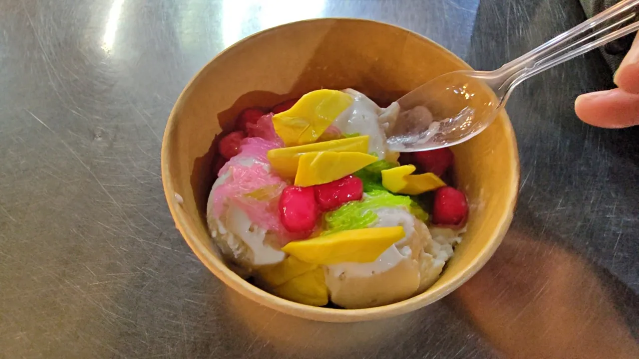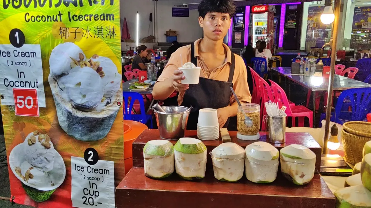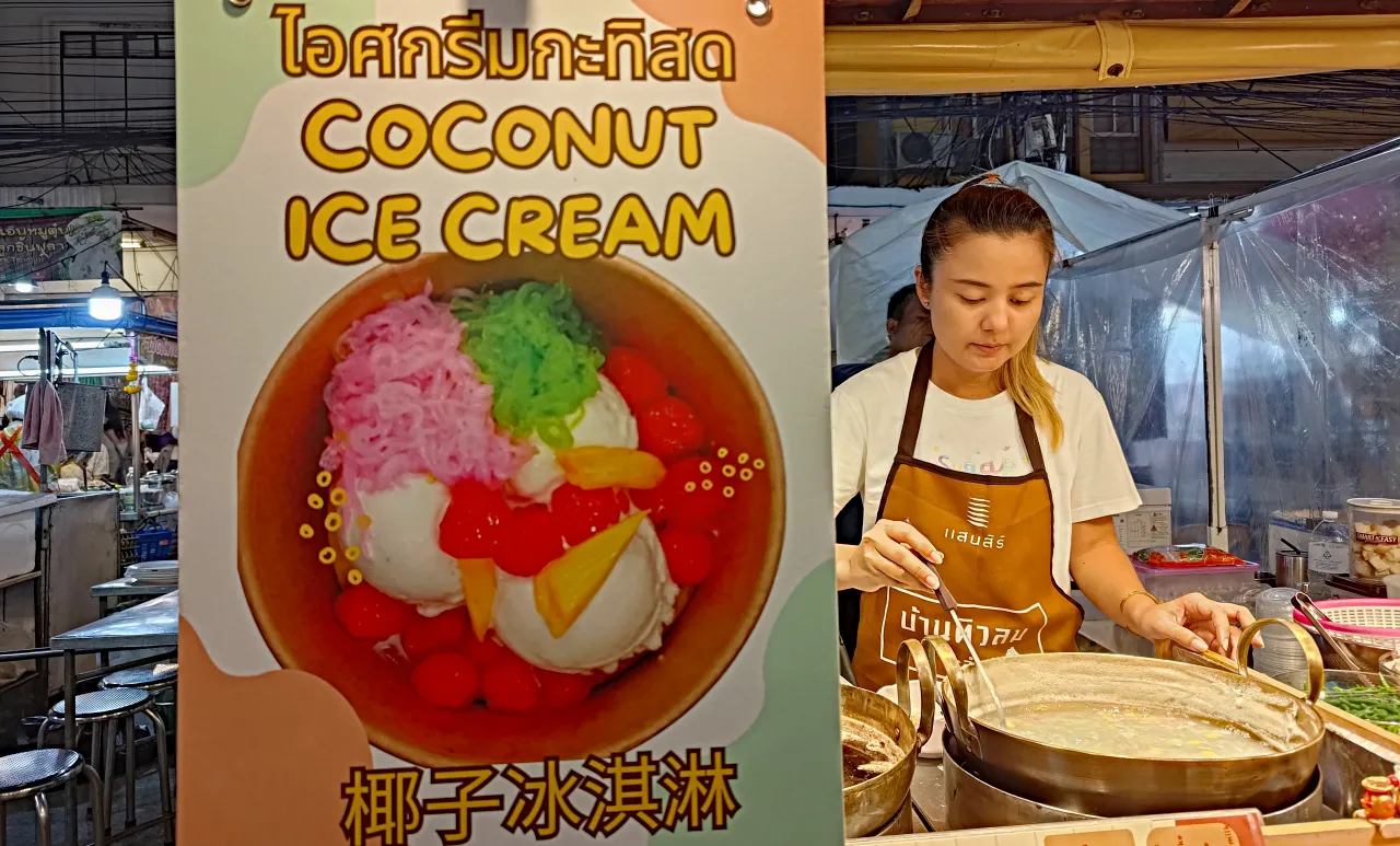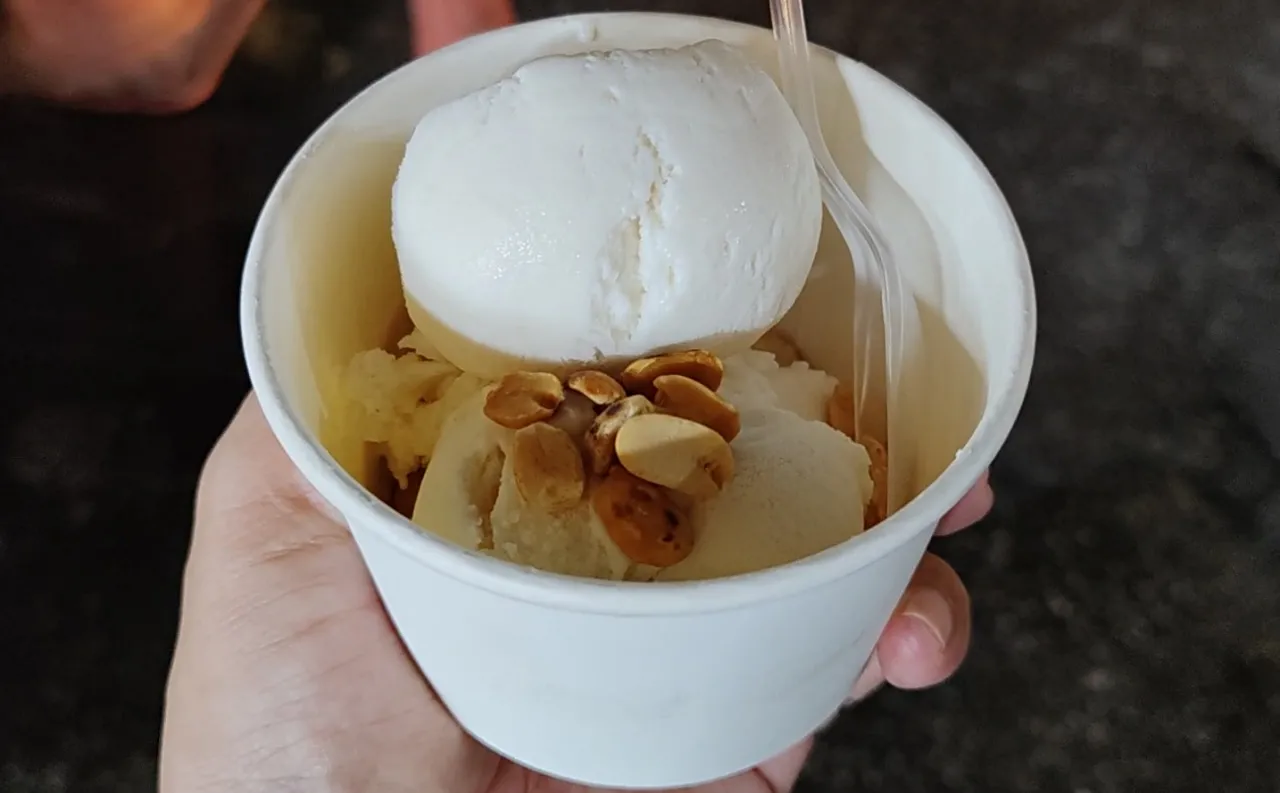 華欣夜市有多家賣椰奶冰淇淋,大多小異,這家2球才20銖,超便宜,給的料多還附上炒熟的脆花生,增添冰淇淋的口感。