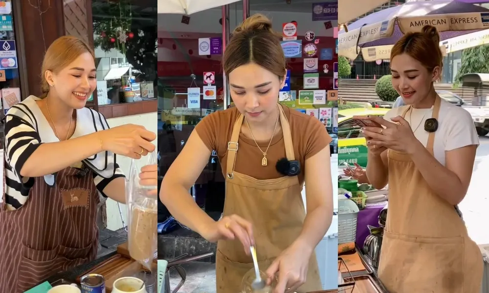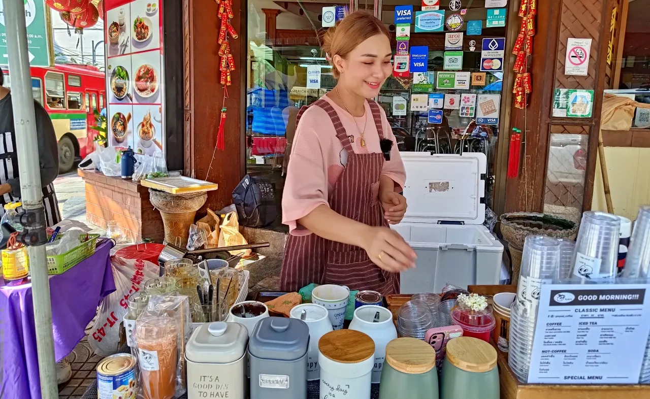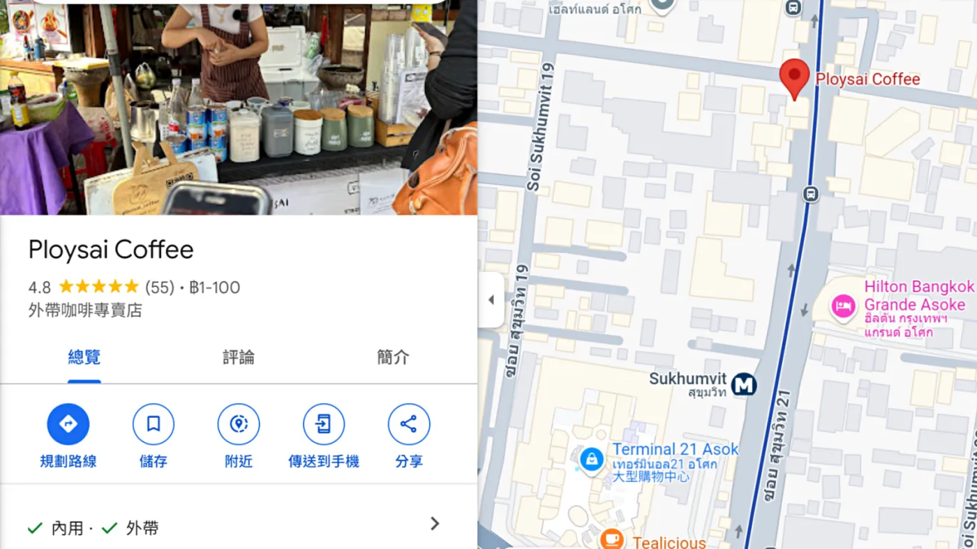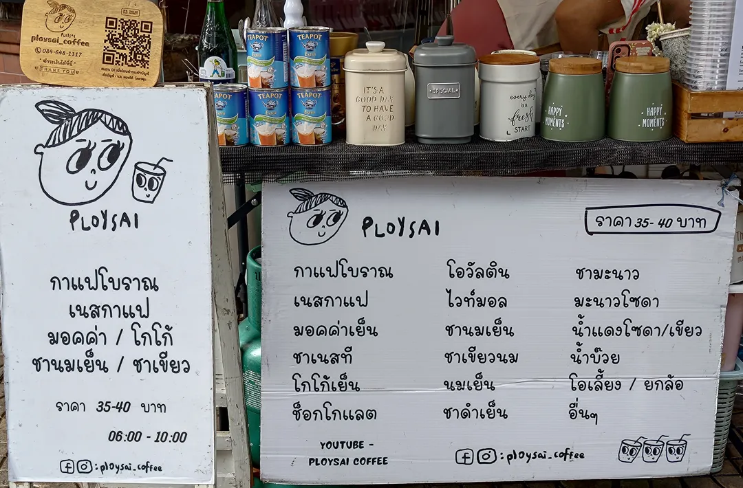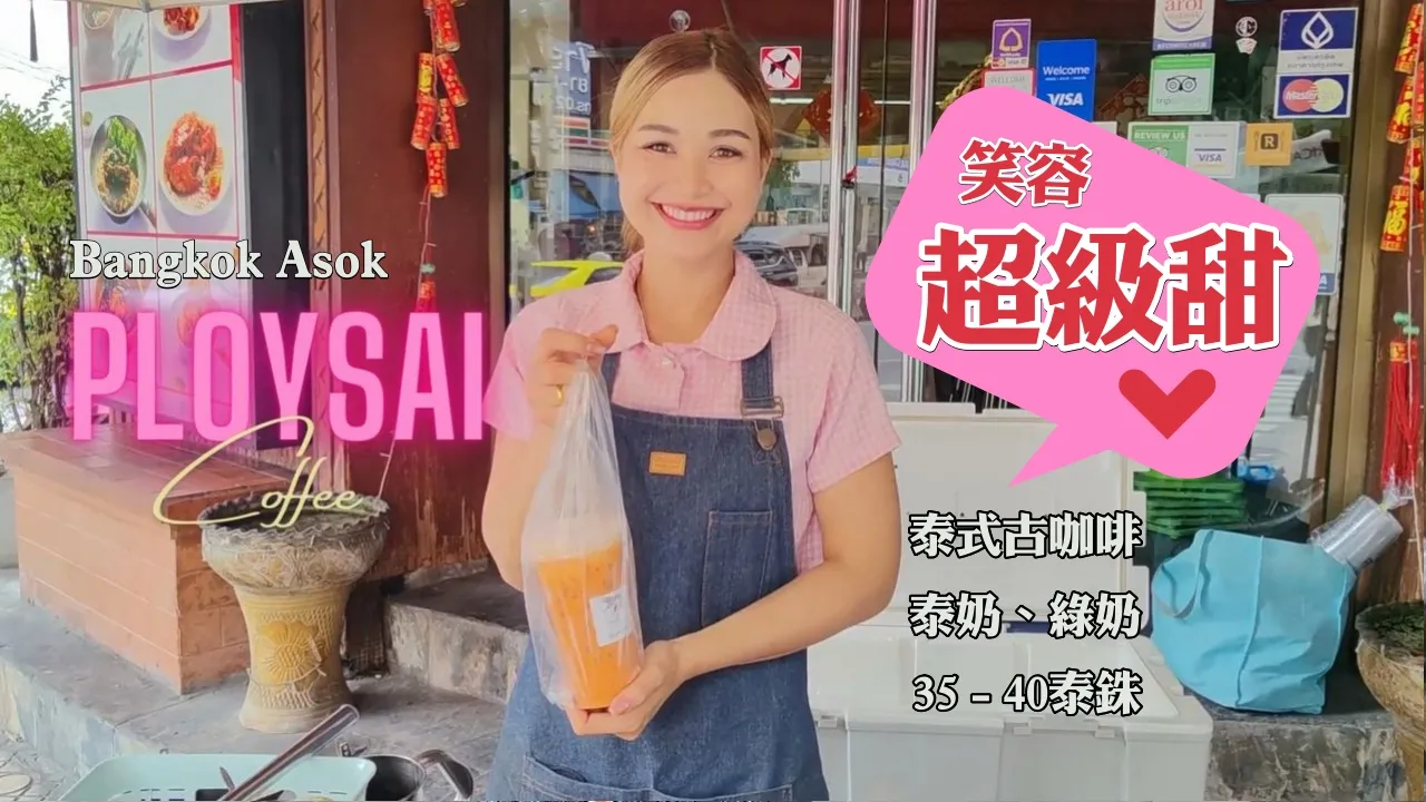 一位年輕妹妹在素坤逸(Sukhumvit) 21 巷繁忙的路口賣咖啡,她在 YouTube、IG等直播,頻道名稱為「Ploysai Coffee」。
