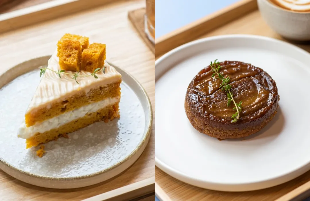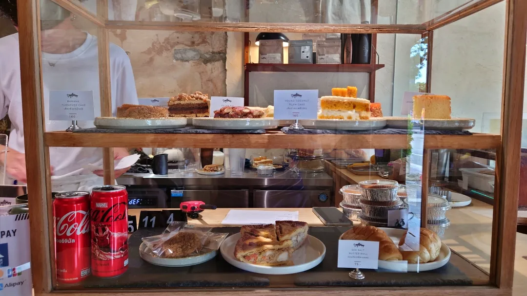 別錯過店內的手作甜點!Banana Turnover Cake(160 泰銖) 靈感來自拉瑪五世時期的經典甜點,焦糖與香蕉香氣交融,每一口都是滿滿的懷舊滋味。還有 Young Coconut Palm Cake(160 泰銖),結合泰國當地食材椰子與棕櫚糖,甜而不膩、口感紮實,是搭配咖啡的絕佳選擇。