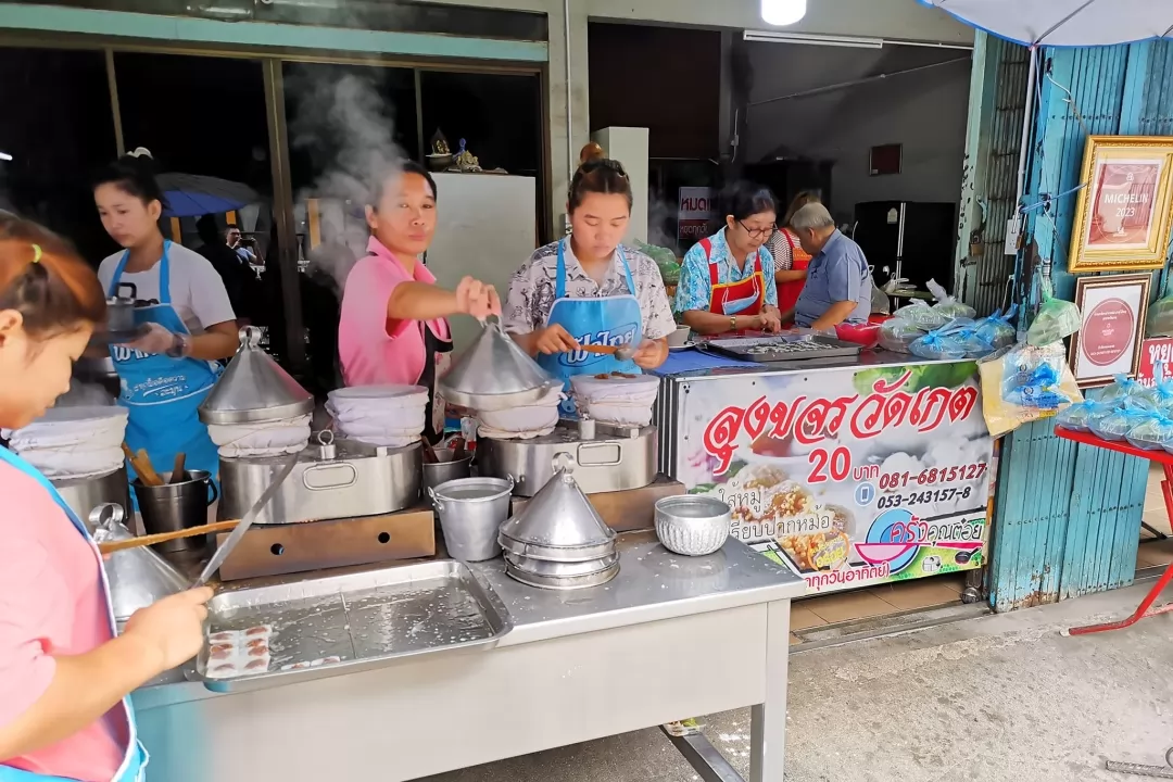 這間超過60年歷史的老字號小吃店,以薄透Q彈的粉皮、甜鹹適中的餡料與新鮮椰漿搭配,成就一口咬下滿滿層次感的絕佳風味,還有解膩的泰國小米辣、以及减肥人士熱衷的新鮮生菜,價格親民僅售20泰銖一盒。作為當地招牌,來清邁絕對不能錯過這道地美味。