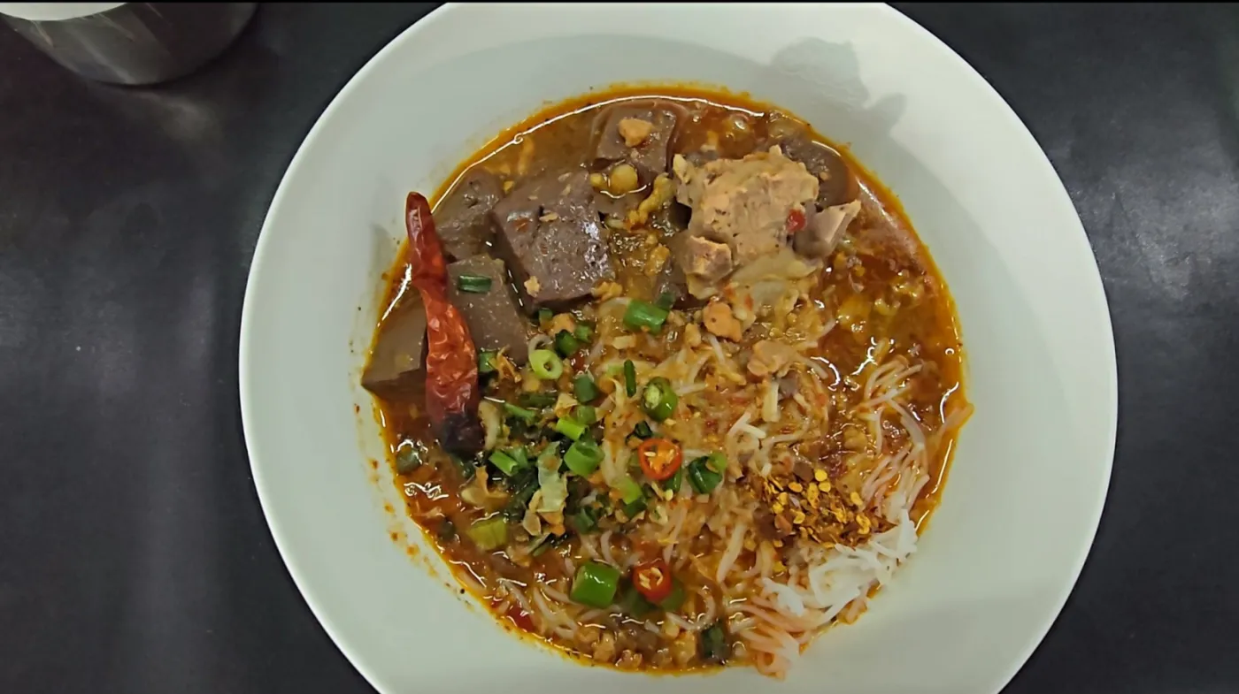 說到清邁必吃,這家泰式涼米線店絕對榜上有名。提供多種口味湯底,如番茄豬肉湯(น้ำเงี้ยว)、綠咖哩、椰奶咖哩、紅咖哩等,每種都與Q彈的米線完美搭配。價格實惠,只需3-5個10銖銅板就能大快朵頤。