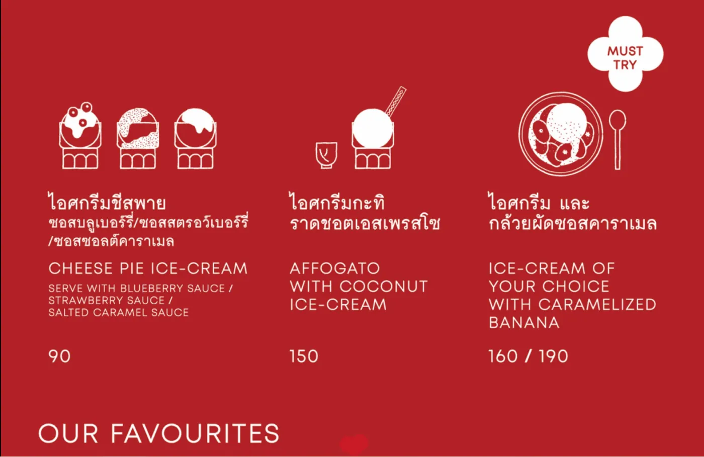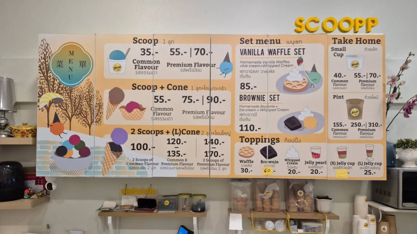 店內裝潢簡單可愛,大片玻璃門上貼滿 冰淇淋甜筒的圖案,非常顯眼好找。櫃台後方的黑板上寫著 超實惠價格,每球冰淇淋 35 泰銖起跳!可加配甜筒、脆餅、鬆餅、果凍甚至布朗尼,選擇多到讓人眼花撩亂。