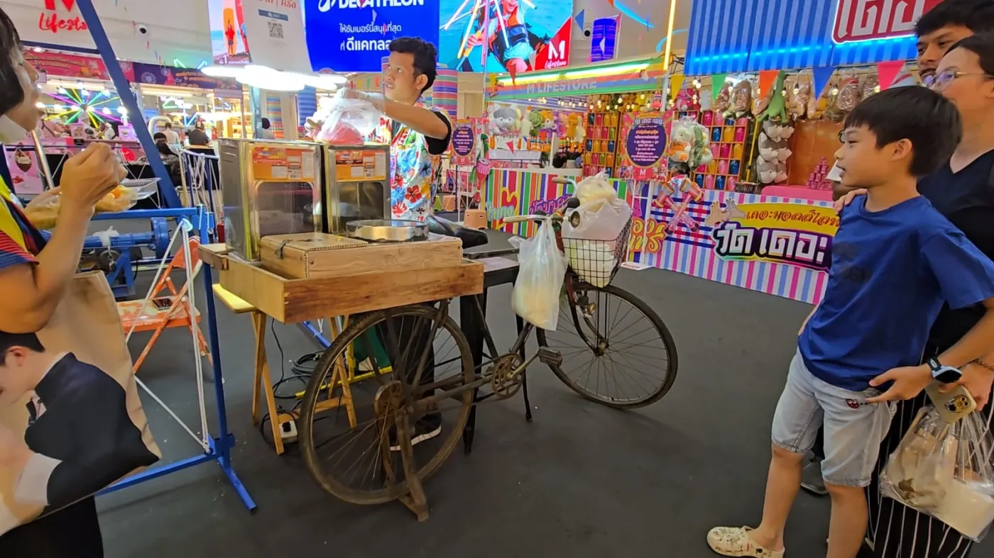 在ICONSIAM、The Mall Bangkapi的美食展上,1輛破舊的腳踏車,除了餅皮和糖絲之外,還有一個電動轉盤,讓客人試試手運,是賺是虧,由它來決定。