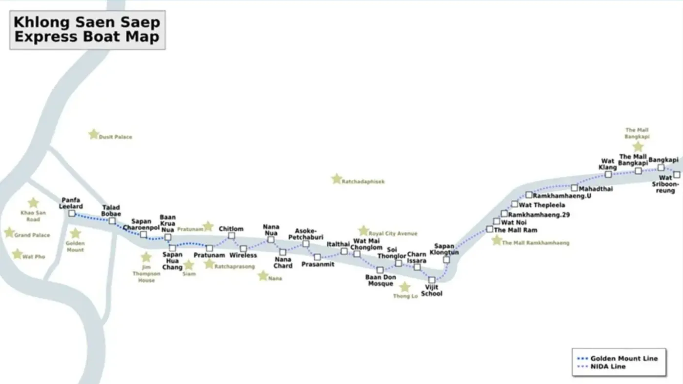 這條運河建於拉瑪三世時期,從湄南河連接到邦帕空(Bang Pa Kong)河,連接舊城區與邦喀比(Bang Kapi)這一段,成為曼谷市區超實用的公共運輸路線!它以「水門市場(Pratunam Pier)」為中央轉運站,分為「金山寺線(西段)」與「NIDA線(東段)」,總共有30個站點。