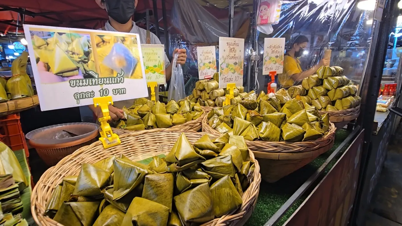 香蕉粽:用葉子包的香蕉粽,是泰國有名的傳統小吃,可以外帶回去當早餐或點心的甜點,不錯吃,1顆10銖。