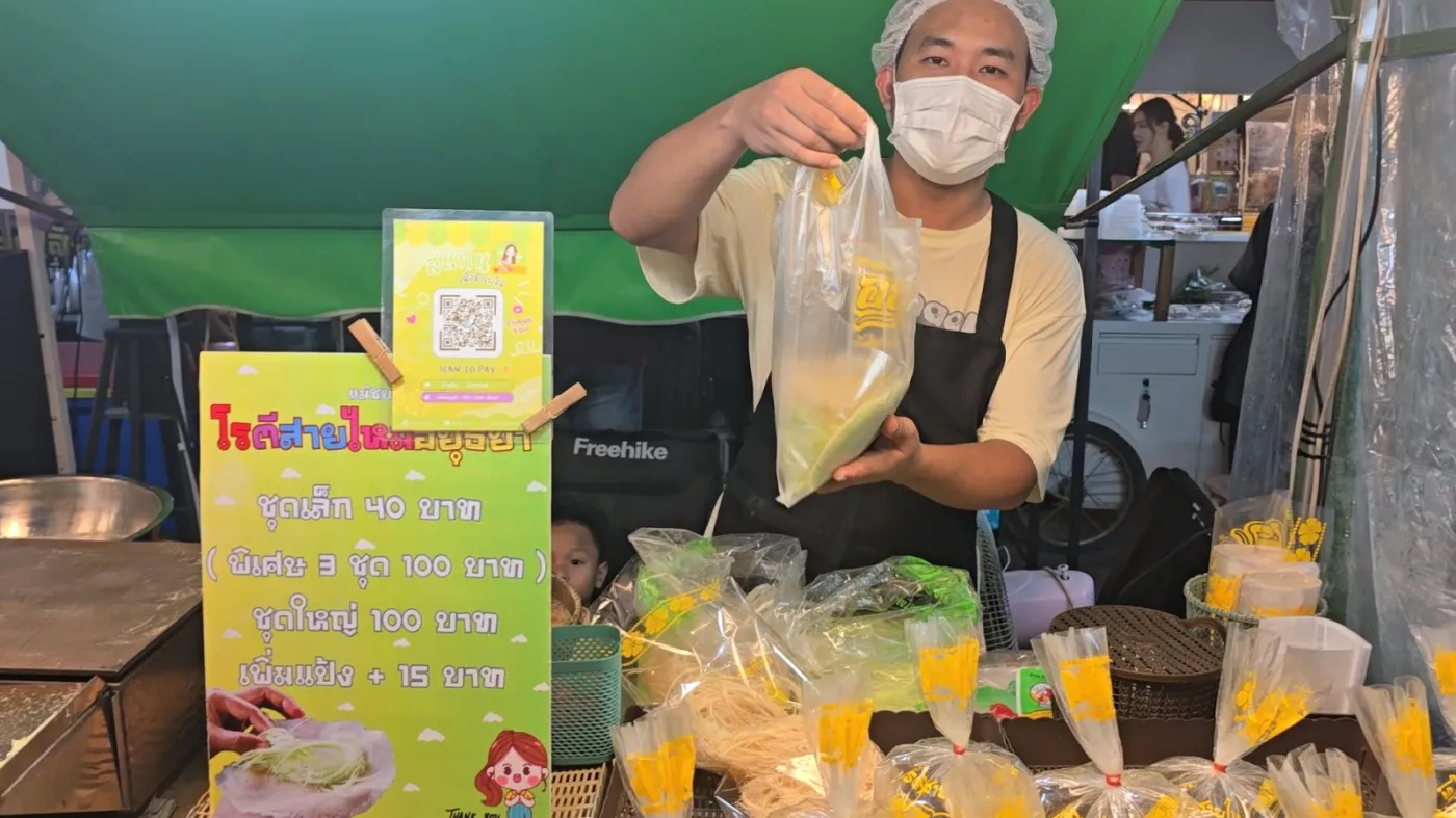 糖絲春捲:這家來自大城府的糖絲春捲,現做餅皮,加上糖絲,1組40銖,外帶回去,一張餅皮加一些糖絲,捲起來吃,解嘴饞!