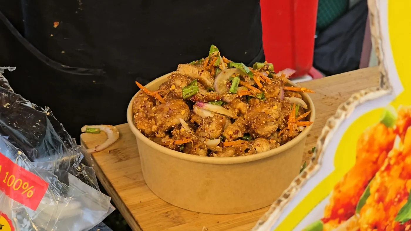 炸雞飯:泰國炸雞是出了名的小吃,隨處可見,值得推薦的是這種,涼拌過的炸雞塊,酸辣超夠味,一口炸雞、一口白飯,包你吃得更香!1盒60銖。