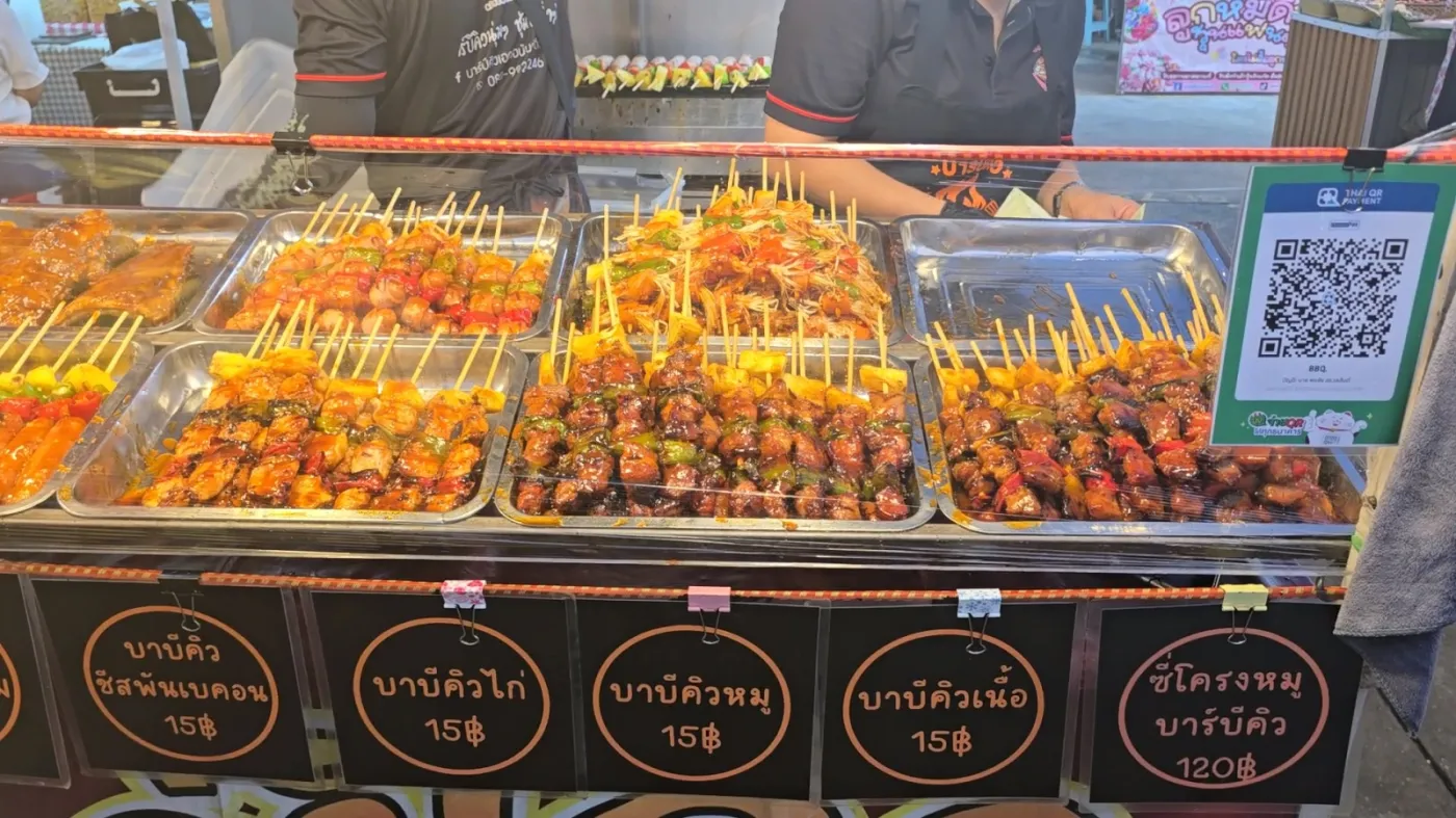 BBQ烤肉:這家巴比q烤肉攤位,有多種口味的烤肉,豬、牛肉1串都是15銖,夠味!