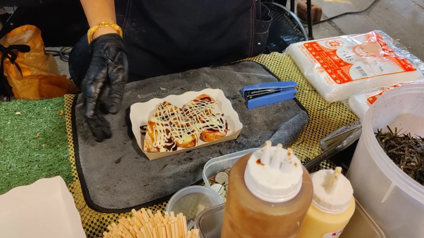 章魚燒:源自日本的章魚燒,但只有半顆,上面鋪上各種海鮮口味,1個10銖,搭配的醬料也與章魚燒一樣,創新的吃法!