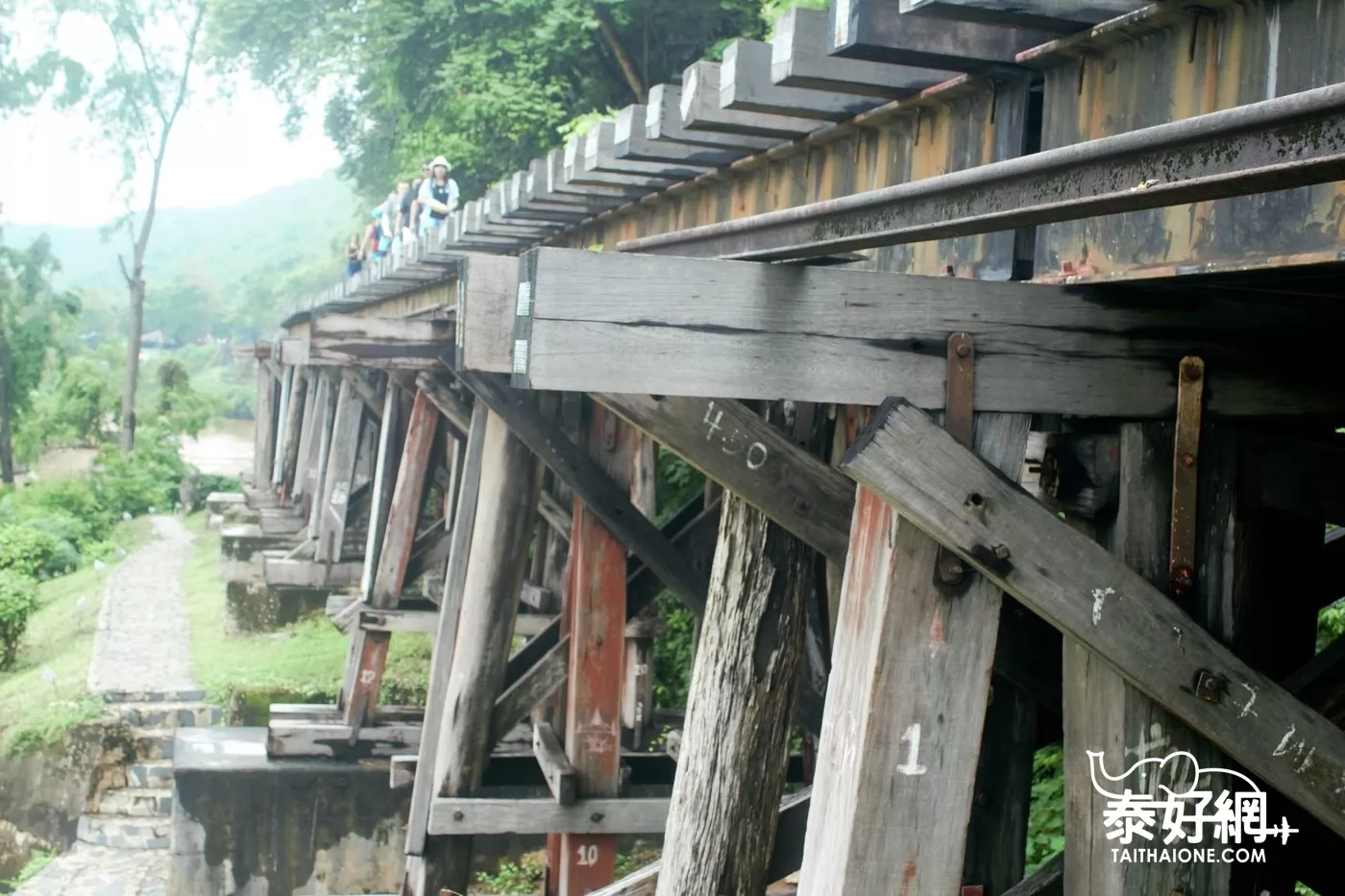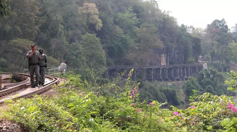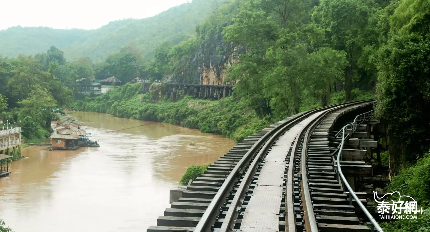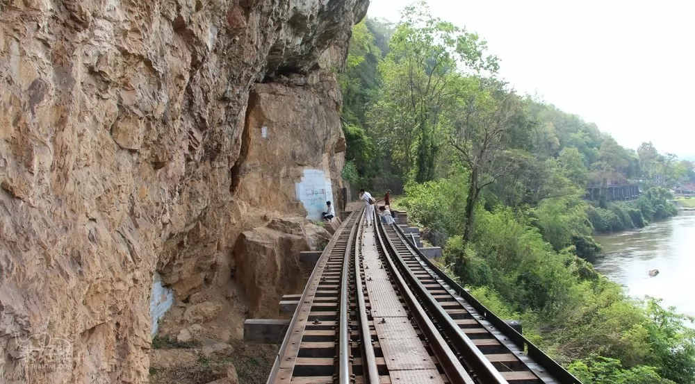 Tham Krasae Bridge是以木板搭建,間以泥石為墩。周遭青山綠水,棧道一邊是光秃黑色岩壁,引人側目,縱然戰事早已遙遠風清,人工鑿痕,依然歷歷可見,不知隕落多少人命,無法想象當年開掘之艱難。其中有順著山崖修建的死亡彎道(Death Curve)路段。