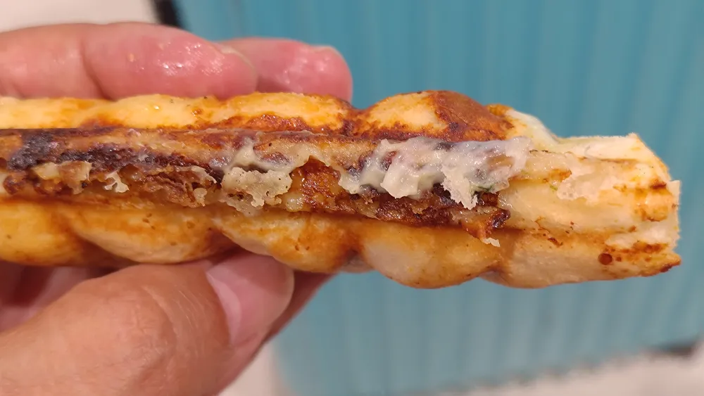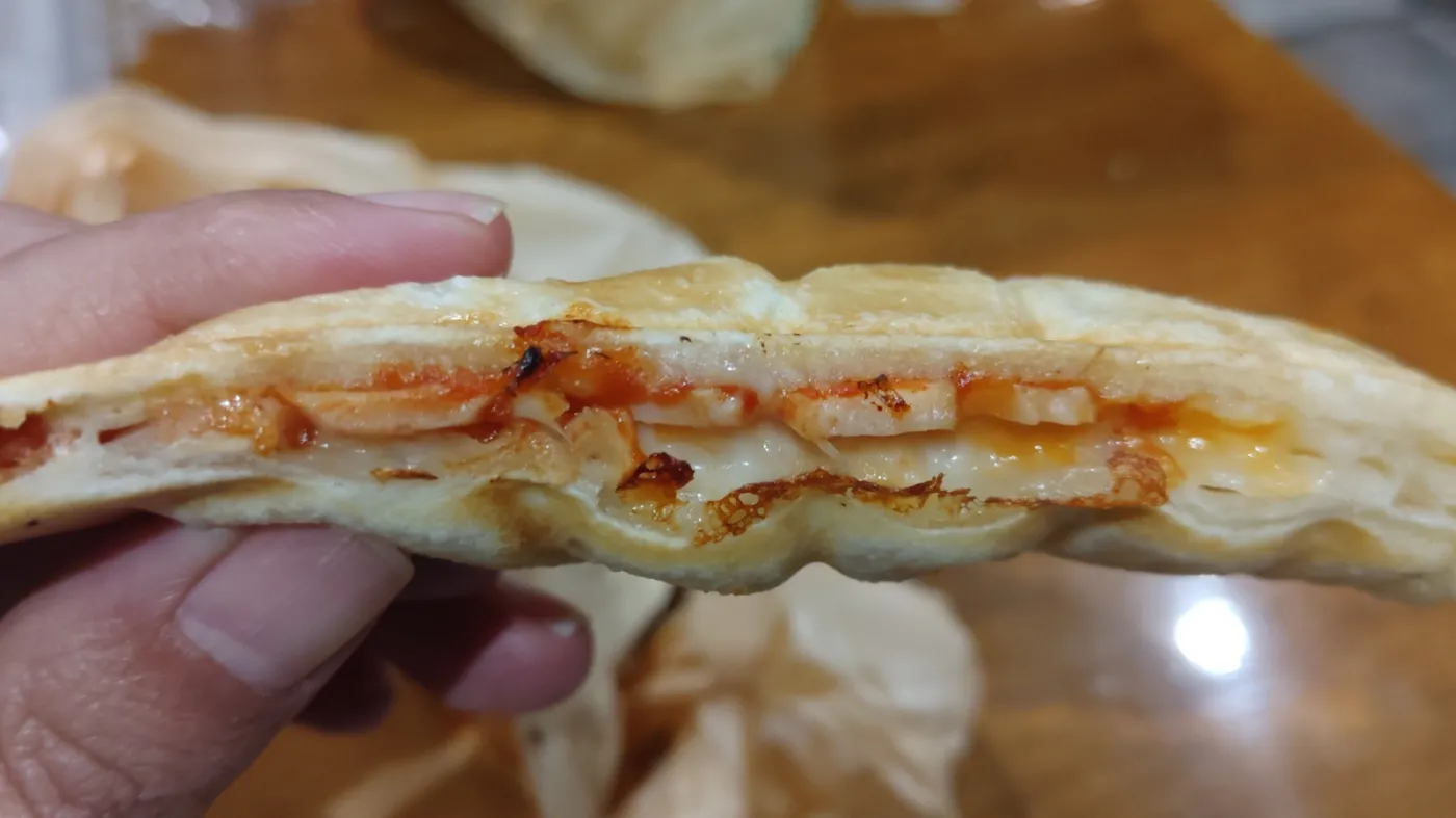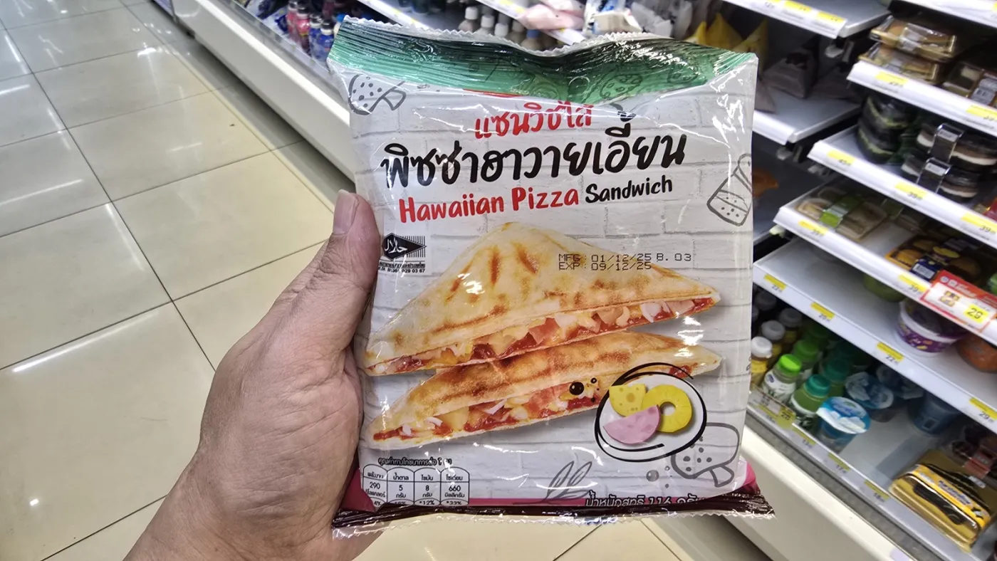 泰國熱壓三明治的口味,真是創意無限,這一款,是夏威夷披薩+三明治的混血款。裡面直接塞滿: 起司、 火腿、 鳳梨。