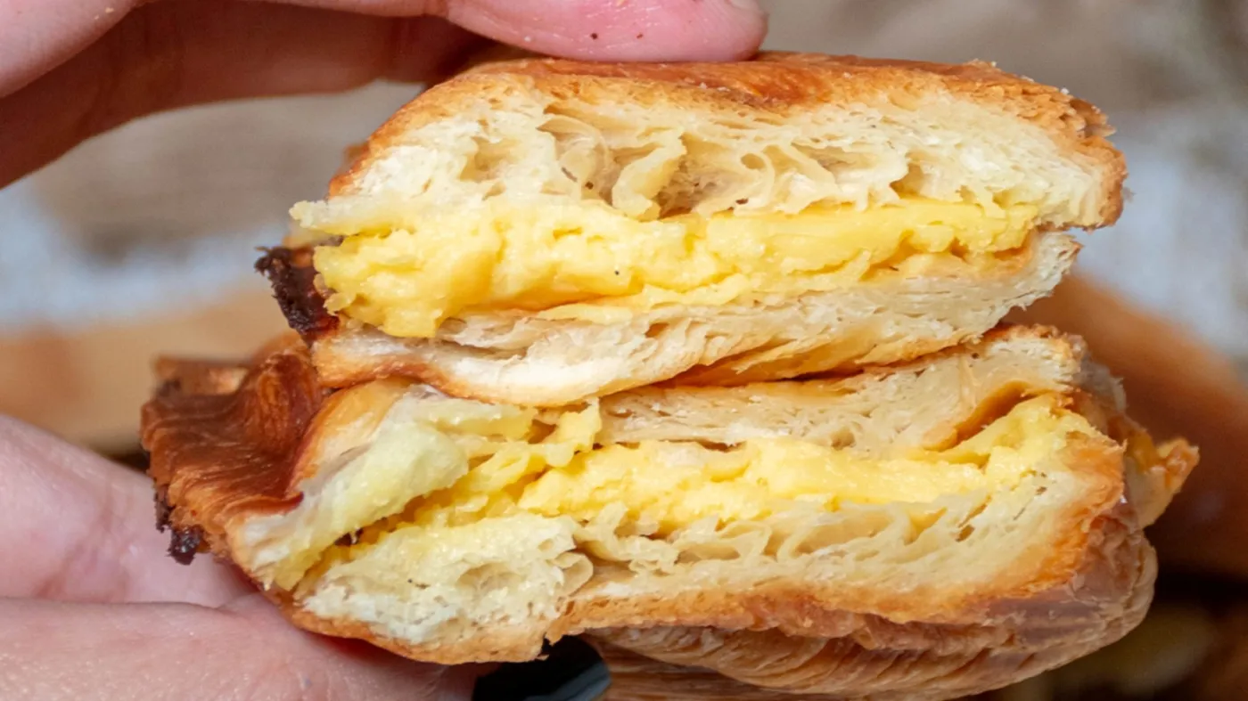 外皮用的是香酥的可頌麵包,內裡鬆軟,香氣撲鼻。蛋塔餡料飽滿,鋪滿整個三明治,吃起來就像吃真正的蛋塔一樣,有夠療癒!最重要的是,沒有蛋塔那麼膩人,超好吃的,第一名!非這款莫屬。