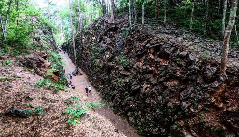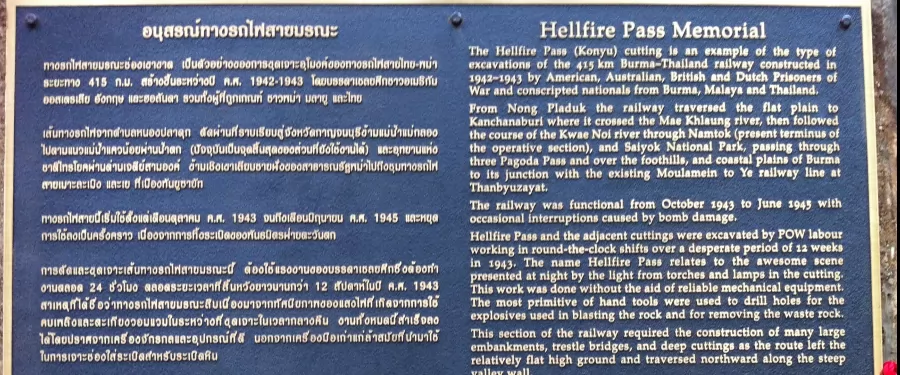 地獄火關口Hellfire Pass(ช่องเขาขาด)位於北碧市中心北面約80公里(1小時車程),當年死亡鐵路建造最困難的一段,長4公里,位於高山森林中,必須要開山劈石,日軍用戰俘把整座山谷(Konyu Cutting)從中間切開,讓鐵路可以經過,可見工程非常浩大艱巨。【2018.4月更新】
