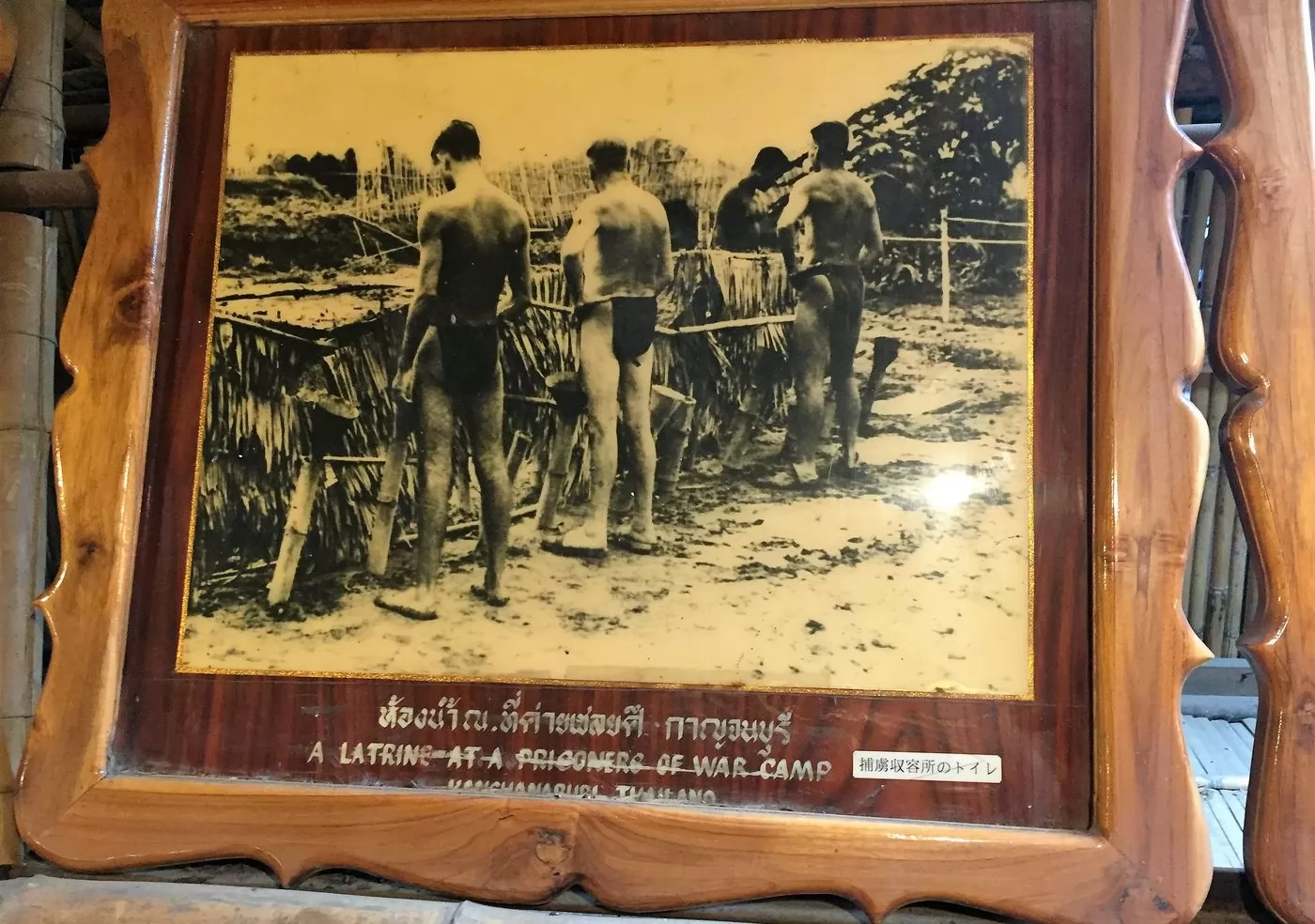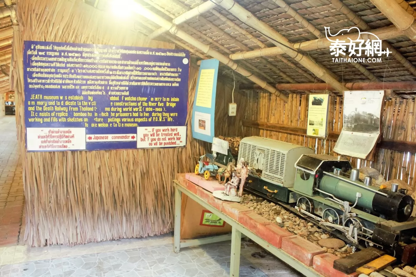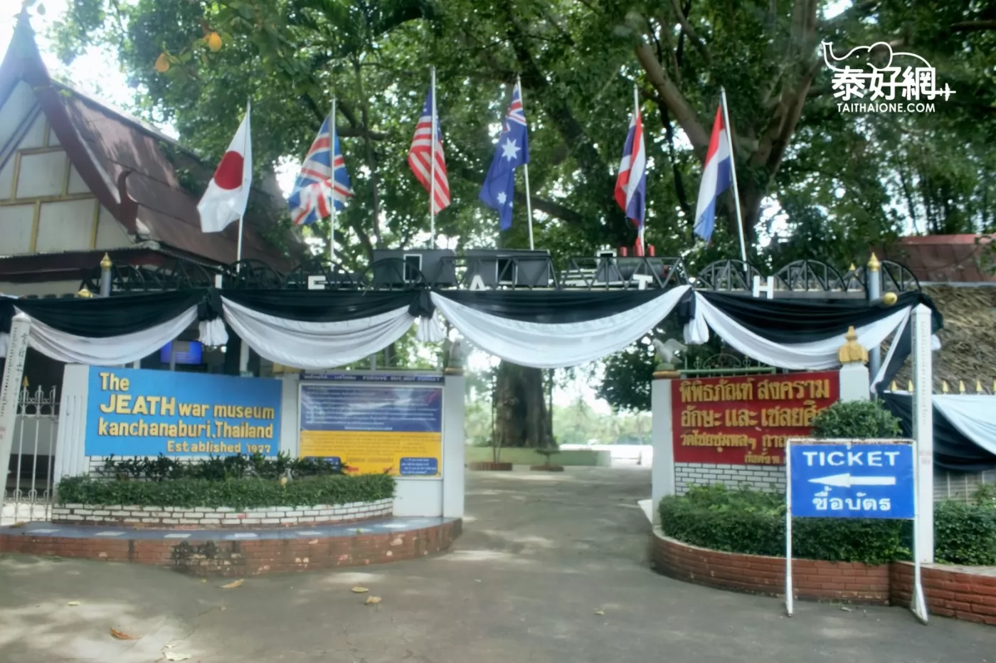 死亡鐵路博物館之一的JEATH War Museum,建設在泰國寺廟(วัดไชยชุมพลชนะสงคราม)裡,門口插著泰國、英國、澳洲、美國、荷蘭及日本的國旗,博物館外觀如當年盟軍戰俘營,用簡單的茅草和竹牆搭建。