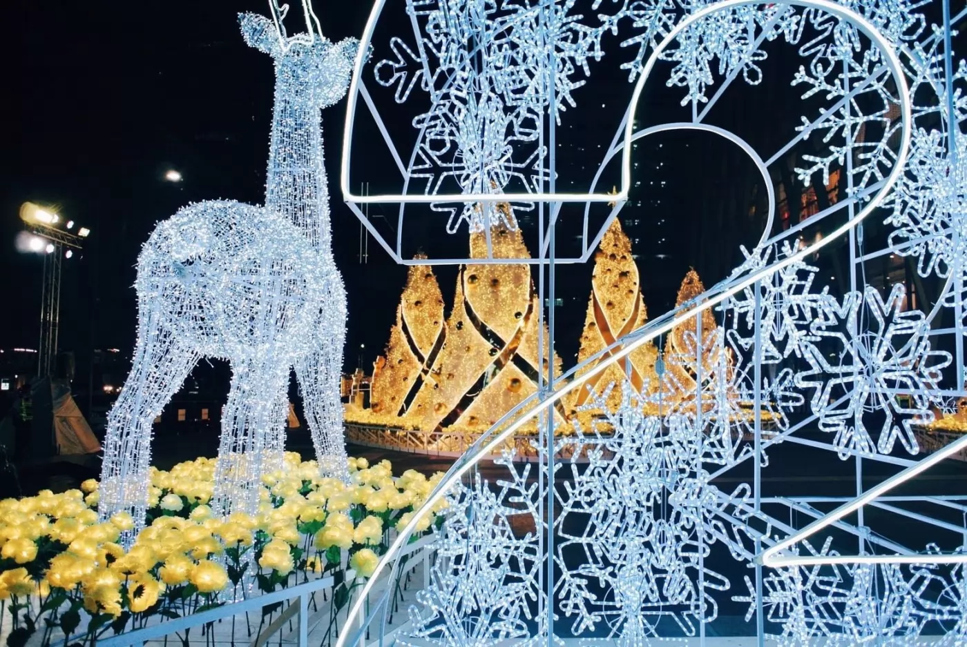 叮叮噹…聖誕節即將臨近,曼谷Central World廣場前精心佈置,可愛的聖誕樹上掛滿了金銀球,各種心形、雪花和卡通燈飾如夢似幻,金色繽紛的世界,營造濃烈浪漫的聖誕節氣氛,讓圍觀的遊客仿佛置身夢幻的童話世界。