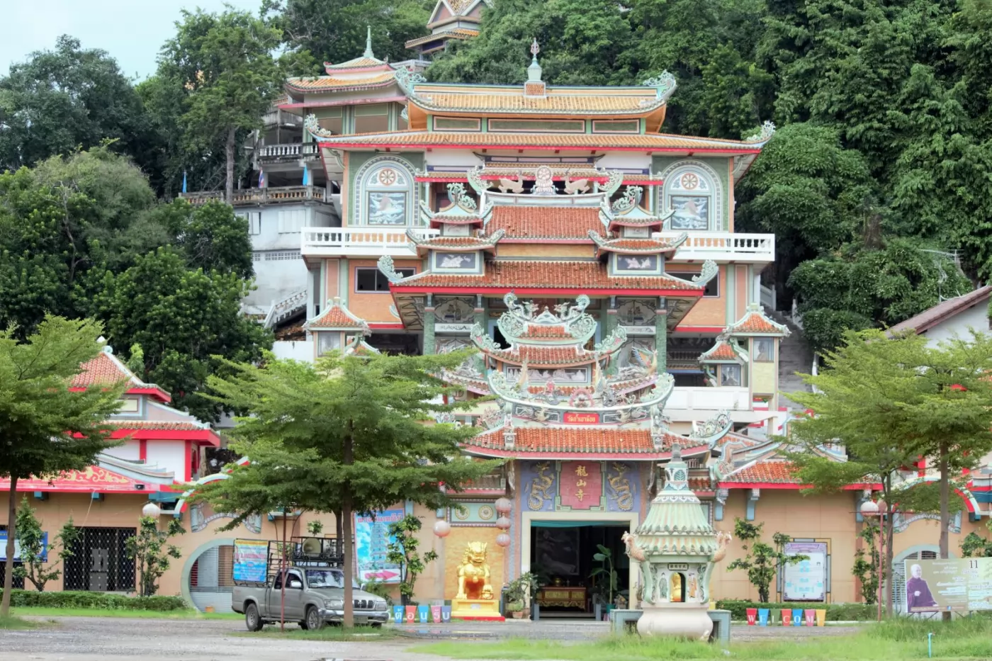 龍山寺(泰文:วัดถ้ำเขาน้อย;英文:Wat Tham Khao Noi),依山勢分層建築而上,最下層寺院,正門入口處有兩隻金色閃亮的獅子,門上懸掛「龍山寺」的匾額,左右兩側圓形拱門上分別寫著「龍騰」、「虎躍」,氣勢不凡。其他廟宇階梯式的建修而上,總共有7層,充滿中國古代建築藝術風格,五顏六色,莊嚴輝煌。