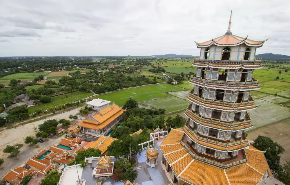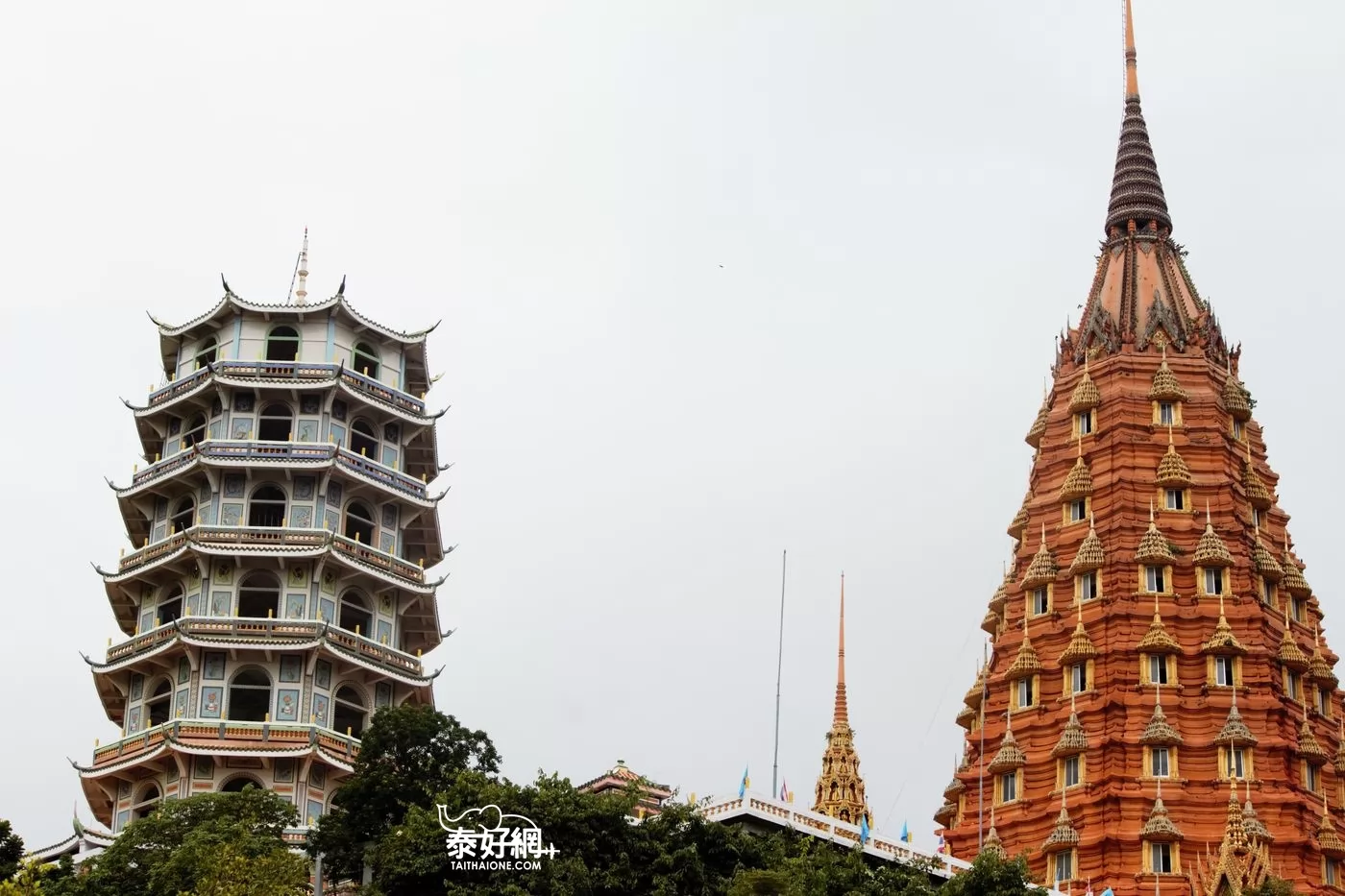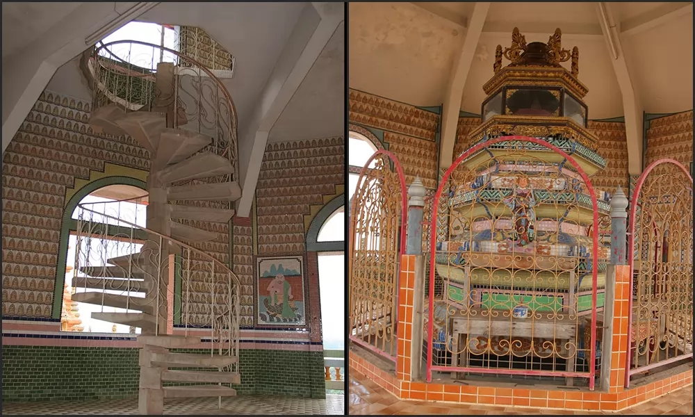 寺廟最引人注目的是頂層是的7層寶塔,舉頭仰望,各層塔樓八角屋簷細尖飛翹,與右側的泰國、印度佛塔相互輝映,爭奇鬥艷,也是一大奇景。