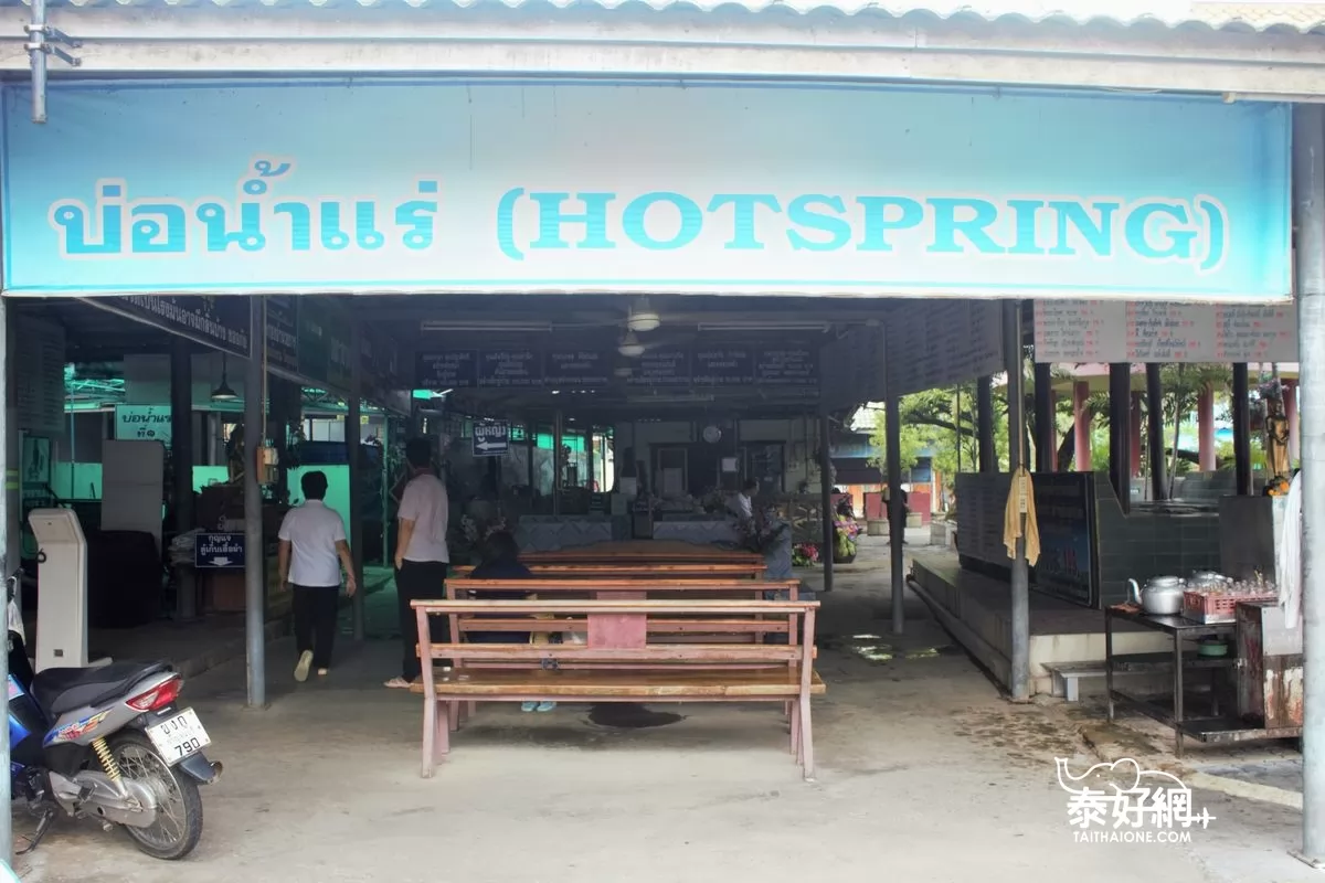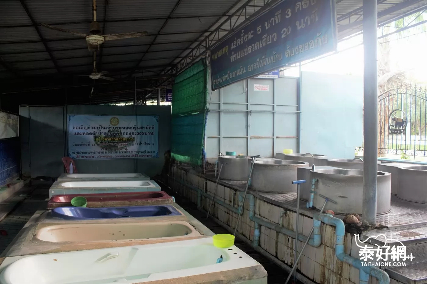 其實可以不用跑那麼遠,在他濃縣(อ.ท่าม่วง)的一座日軍軍營也可以泡湯,日軍二次大戰敗後,軍營改建為寺廟วัดวังขนายทายิการาม,住持考量到信眾治病的需要,免費開放,從寺廟大門進來後的左手邊就是泡湯(Hot Springs)的地方,分泡腳區(不分男女)和沐浴區(男女分區的公共澡堂)。