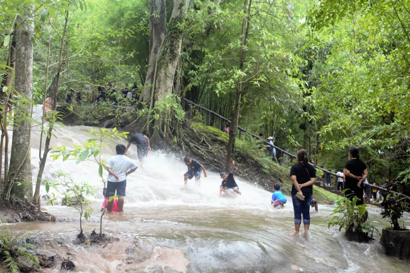 瀑布高約15公尺,分為兩個層級,第一層級水流大又快,要成人才能站到一面,右側有階梯可上去;第二層級的水流緩慢下來,聚水區成為小孩們戲水的樂園。